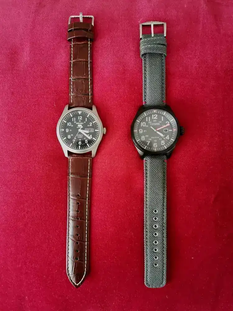 Empecé con los de remonte manual, tengo dos Vostok Komandirskie , cada uno de un color y un Poljot que también compré que tiene 40 años y va estupendo. Después compré el Seiko Military. Me seguía faltando algo.Contento con todos , pero con algún pero. No me gusta que los relojes se me paren, me da mucha rabia ( no pienso eso que dicen que los mecánicos tienen alma, porque si no, verlos parados es verlos muertos, jajaj) así que todos lo días a dar cuerda y mover el Seiko. El Seiko tiene una precisión excelente , sobre + 2 segundos días, y los Vostok para su precio también , sobre +8 pero en estos influye mucho si me los he puesto, si tiene mucha cuerda, la posición en la que duermen, vamos como tener un niño chico. Quería tener algo más práctico para diario y he acabado comprando un Citizen Eco drive, mi hijo ya tenía uno y estoy encantado. Me he dado cuenta que los que mas me gustan son los relojes de tipo militar y de 40-42mm, de eso se da uno cuenta con el tiempo. Estuve a punto de regalar el Seiko a mi hijo, pero no lo quiso, era mucho para él. A mi otro hijo le regale el Tissot PRC 200. No me gusta acumular.Tambien valoro las marcas que se lo hacen todo, manufactura o como queráis llamarlo. En contra de la mayoría , tampoco me gustan los divers ni los armis, para mi es como tener una esposa, tampoco los relojes joya o que brillen mucho. Voy a seguir conservando los relojes que tengo, El Poljot mas de vestir, los Vostok de vez en cuando, pero los dos relojes que usaré el 95% con los que estoy a gusto y contento son el Seiko y el Citizen. El Seiko es muy versátil cambiándole la correo o poniéndole una nato.La foto con el movil, no le hacen justicia a ninguno de los dos.