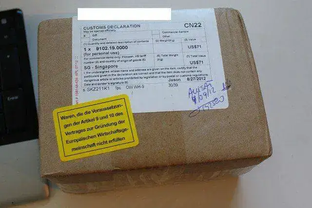 El martes 4 de septiembre llegó el cartero con el paquete, 11 días reales y tan sólo 7 laborables ya que pilló dos fines de semana, lo que me parece un tiempo mas que aceptable teniendo en cuenta el lugar de procedencia. En el paquete pone que el país de origen es Singapur, pero pasa por Deutsche Post, asi que tal como indicabais en los foros, parece que el recorrido es siempre Singapur-Alemania-España. Primer Minipunto para Watches-Bay.