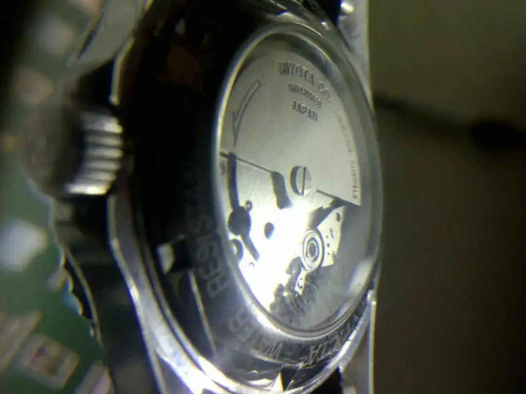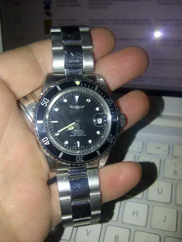 Pues aquí os lo muestro, un autentico superviviente, arrinconado después de un trato inmisericorde por parte de sus dueños, fue regalado, después devuelto de malas maneras por estúpidas rencillas, después queriendo reinventar la rueda sin consultar a los expertos quise cambiar el bisel de la manera mas absurda y conseguí cargarme la corona, estuvo así mas de dos años, después no sabiendo que hacer con el intente repararlo por mi mismo, conseguí humedades dentro de la esfera, pues llevaba mas de dos años abierto, con triquiñuelas conseguí que se fueran y aquí lo tenéis, la corona hace su función de hermetismo para el agua, pero para ajustar la hora tendré que desmontarlo para el cambio de los días del mes, no me importa, será mi reloj de batalla, ha demostrado ser resistente, muy preciso y leal, lo llevo desde hace tres semanas y no os creeríais que no lleva ningún desajuste, no me lo creo ni yo, va al segundo. Me gusta mi calibre made in Japan, ha sabido aguantar el temporal mejor que yo, saludos compis.