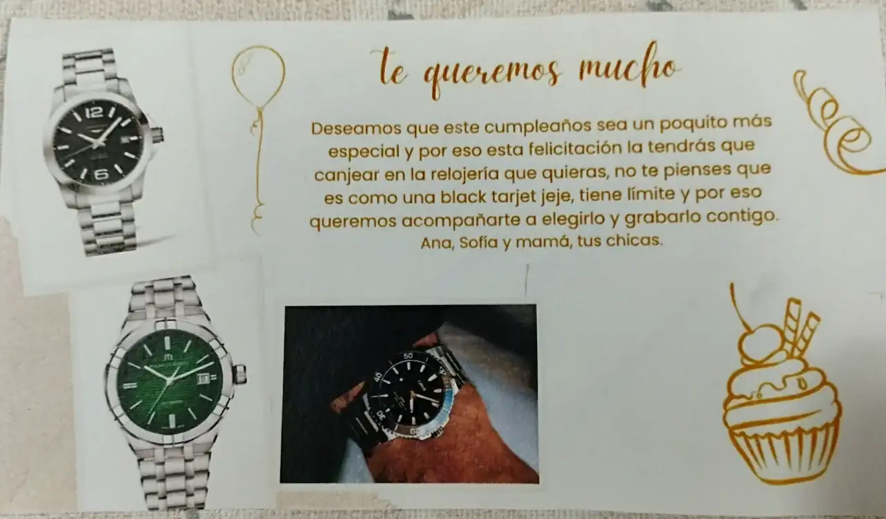 Pues eso, que mi mujer me regala un reloj para mi 40 cumpleaños, y como es más inteligente que yo, me ha hecho una tarjeta preciosa para que vaya a probarme relojes y elija el que me enamore.