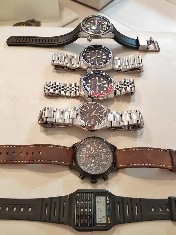 El primero es un Seiko Sumo negro modificado. Tiene insert cerámico, cristal de zafiro y malla de caucho crafter blue. El mejor de los que tengo.