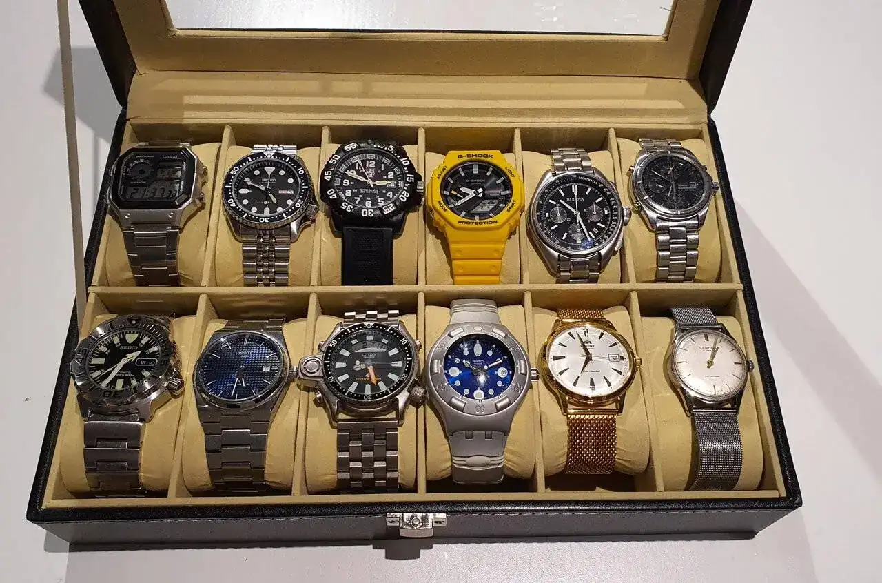 El casio royale, pertenece al grupo de relojes que dan mucho por muy poco. Seiko 009, era de mi cuñado, falleció en accidente de tránsito y días antes me lo dio, quizás el reloj con más valor de mundo para mi. Un luminox colormark, el saber que ahí dentro hay isotopos radioactivos me alucina. Otro casio, el casioak, versión nueva con Bluetooth que no sirve para nada, pero interesante la carga solar, también compré el kit chino para vestirlo de acero. Bulova pilot, comprado a un compi del foro, no le hagáis caso a los pantalones que lleva, los suyos originales están guardados. Seiko, muy especial, el primero que compré con mi dinero hace muuuuchos años. Lo particular es que es el primer reloj de cuarzo de muñeca del mundo en contar las centésimas, es una pasada ver girar la aguja roja de las centésimas, bueno, es que ni se ve de lo rápido que va. Un monster de primera generación, lo compré nuevo cuando salió y va como un tiro. Un PRX powermatic, no sé qué más decir de este que no se haya dicho... un aqualand de segunda generacion, no es de la reedicion, una pieza con mucha historia en el mundillo submarino. Un swatch scuba, lleva conmigo desde que lo compré nuevo creo que en el 85. Un bambino muuuy clasicon, para llevarlo cuando sea abuelo, me lo autoregalé en un cumple. Un certina de cuerda que me dio mi abuelo, diria que de los 60, no sé, pero le tengo mucho cariño.