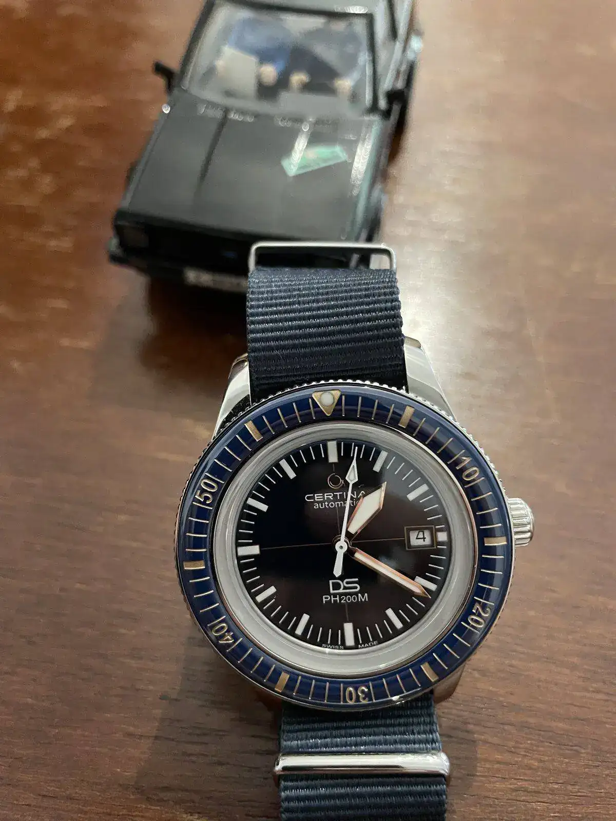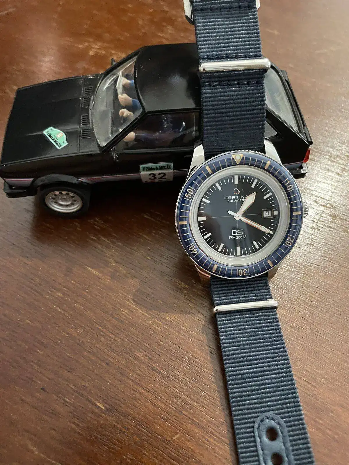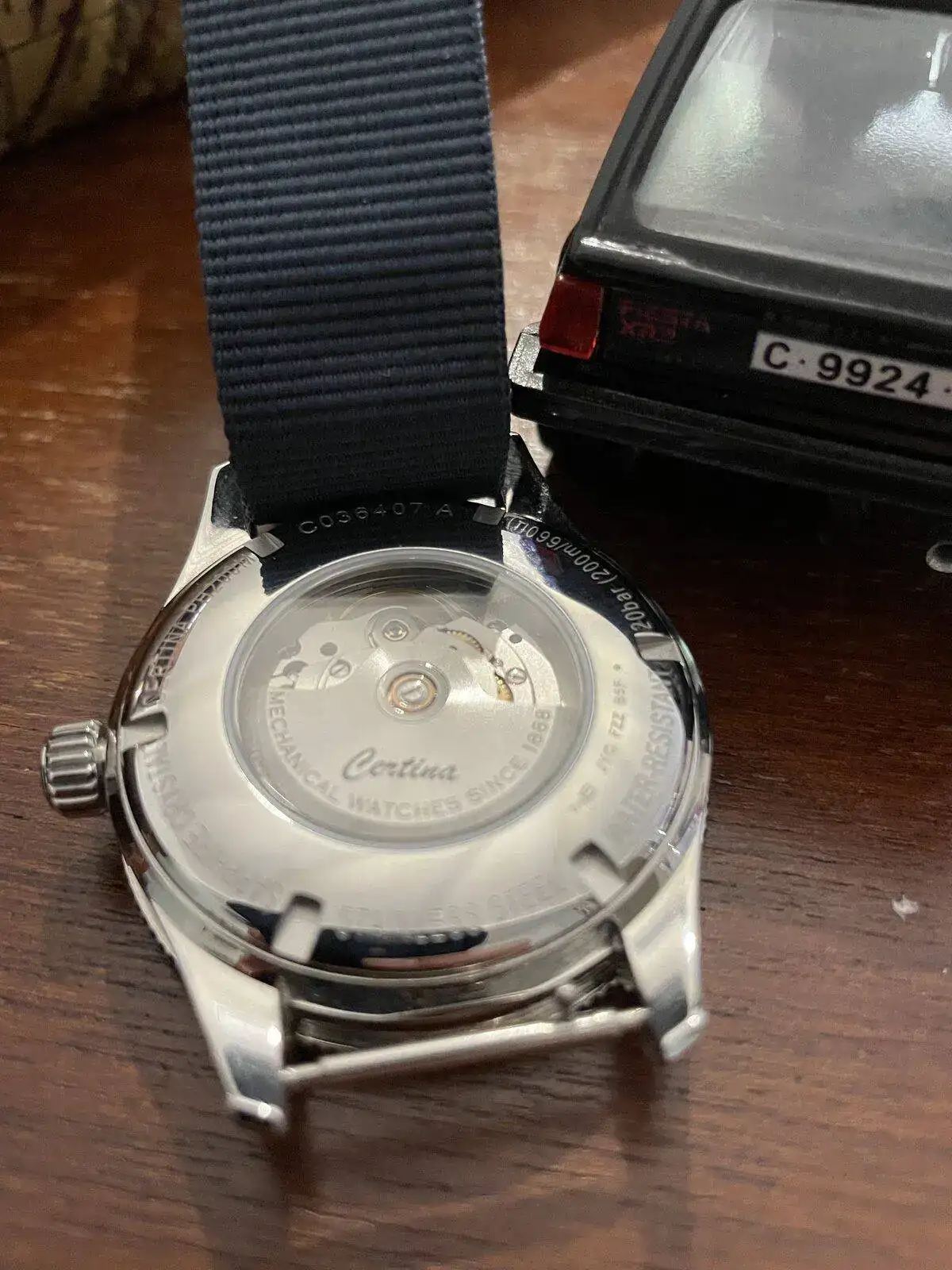 Ahora sí, aquí van las fotos y pido disculpas por tan larga historia y haberos aburrido para que al final sea un humilde Certina. Pero resulta un reloj que a mi modo de verlo ofrece mucho por su valor. Es un reloj precioso, tanto en azul como en negro y estoy seguro que seguirán sacando más colores de este modelo. Con un toque vintage muy conseguido, un tamaño grande pero sin exagerar, con una lectura rápida y fácil, maquinaria powermatic 80 contrastada y de muy buena calidad y muy versatil, admite una milanesa, un correa de piel, una nato, etc....