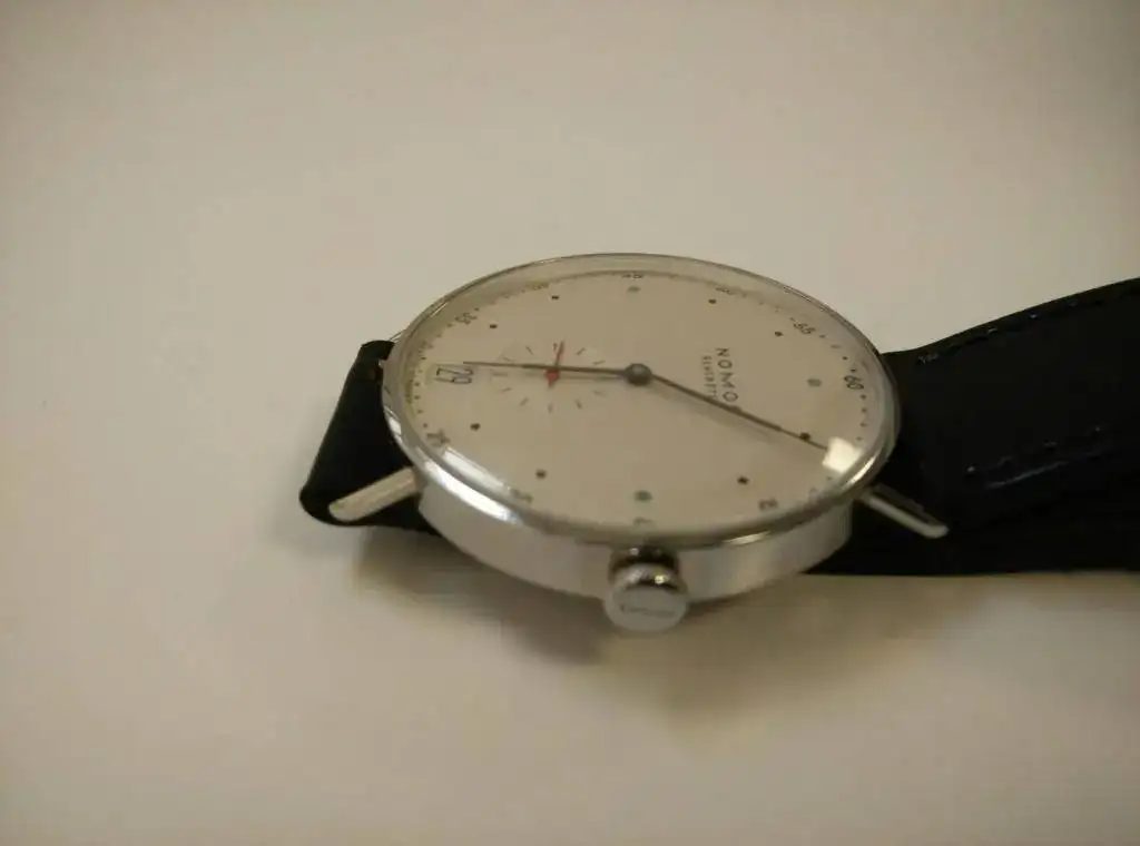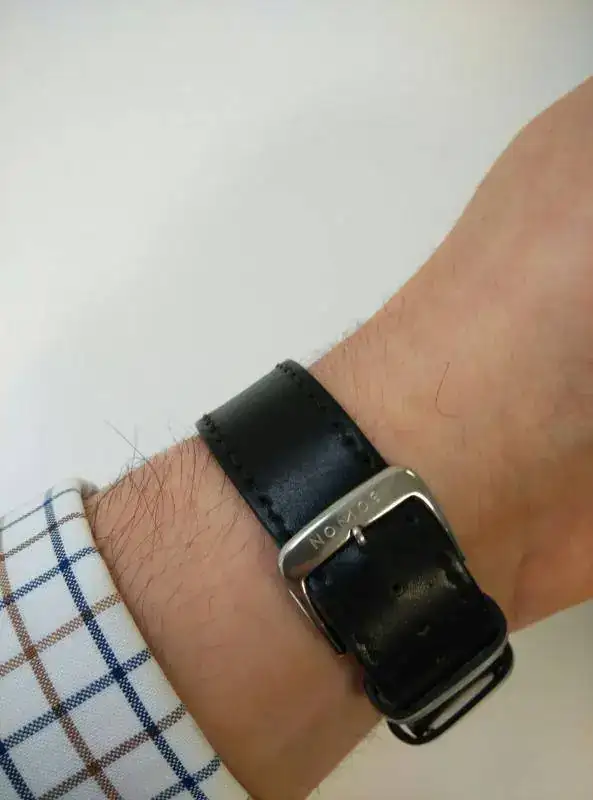 La correa es de piel Horween Shell Cordovam de buena calidad con un sistema de cambio rápido de correa y 19 milímetros de anchura, en color negro y cierre con las letras de Nomos grabadas.