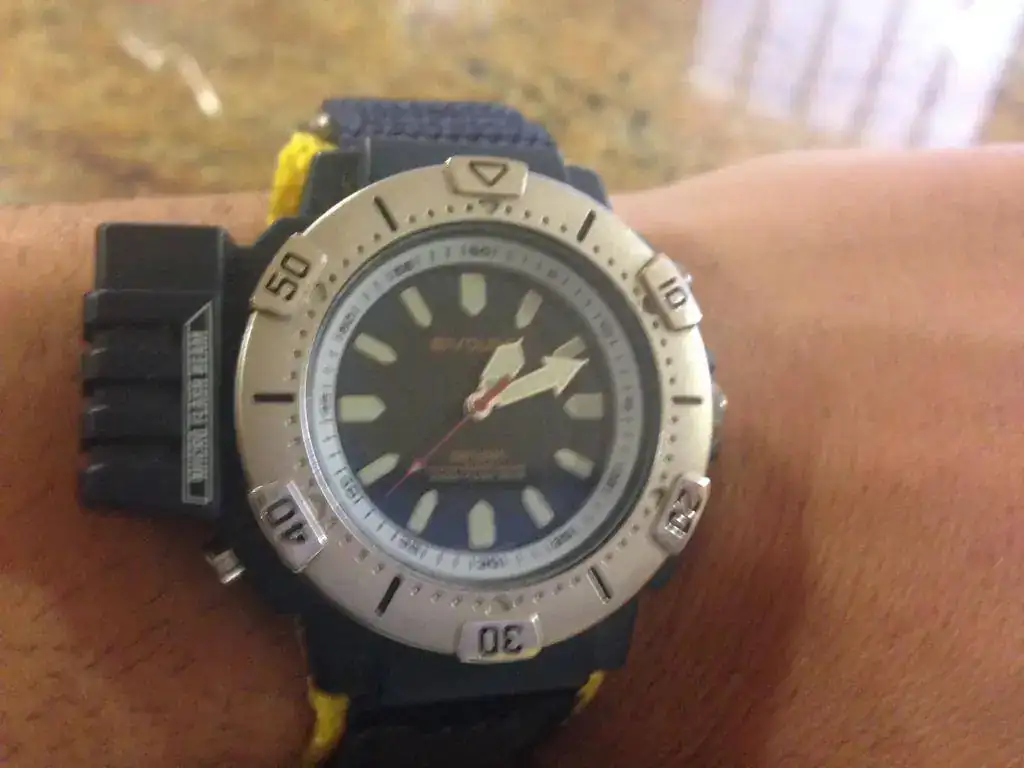 Bueno pues despues de unos dias ya tengo en casa mi nuevo diver.decir que es de finales de los 90 por lo que he podido averiguar y que se encuentra en un estado francamente bueno, es un wr 100 m y mide 54 mm de ancho.
