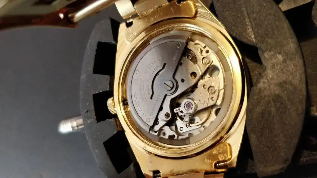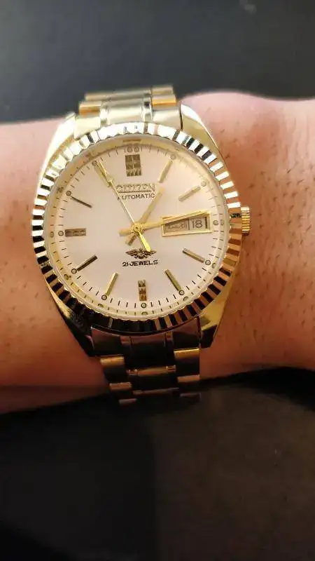 Lleva un Miyota 8200A, caja de 35mm (a ojo de buen cubero), 21 joyas, día en árabe e inglés.