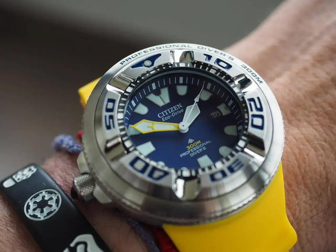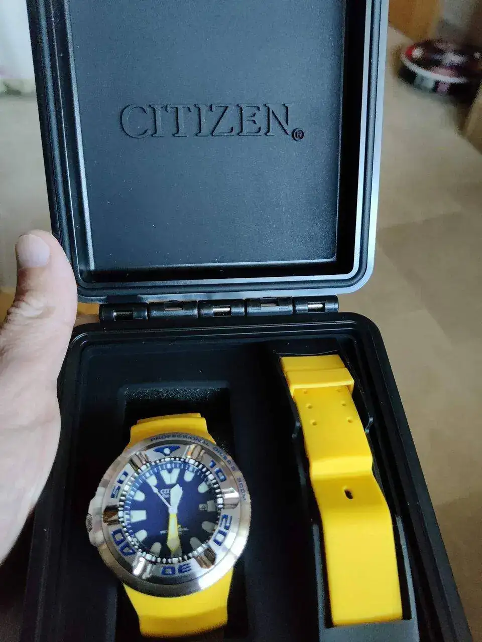 Hoy os traigo esta nueva versión del archi conocido Citizen Promaster Ecozilla, la referencia BJ8058-06L, mismas medidas mismo todo a escepcion del estuche que es tipo pelican, el caucho también parece algo más suave o eso me parece comparado con el original!! , la esfera azul es espectacular y la combinación con los índices y caucho amarillos me parecen muy acertados, aunque para gustos los colores, como ya sabéis este reloj no es apto para todas las muñecas afortunadamente soy de muñeca generosa y manos como dos tortas de Inés Rosales juntas😂, me está pidiendo a gritos bautizo marino, espero que pase de una vez este temporal de levante y pueda darle lo suyo como dios manda.