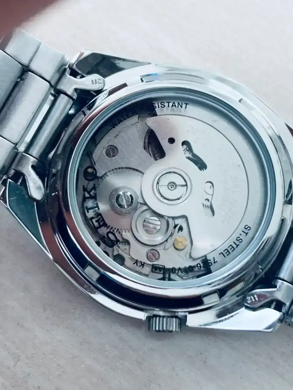 Lo que me llama la atención es que no tiene el embellecedor "marco " metálico alrededor del calendario. Por lo demás todo perfecto, la correa metálica parece más sólida que en otros modelos y en la parte trasera se puede ver la maquinaria 7S26C -21 jewels. Soy partidario de usar estes relojes hasta que aguanten, nada de revisión a los 3-5 años si funciona bien. Hay gente que tiene Seikos usándolos a diario desde los años 70 y 80 y ahí siguen...... nosé si compartís mi criterio en cuanto a esto mi presupuesto es el que es😂😂