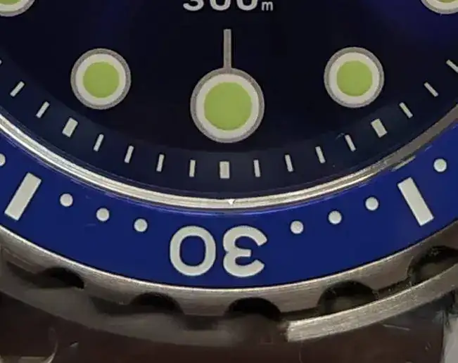El gran problema que tengo es que no sé si tengo en mis manos un addiesdive o un seiko. ¿Y eso? Os preguntareis, gustosamente os cuento que en la zona de las 6 no han dado ni una y está la cosa bien descentrada😂😂 (me trae buenos recuerdos de mi minituna). Bisel e índices se han ido de borrachera. Además de una pequeña muesca por encima del bisel interior.