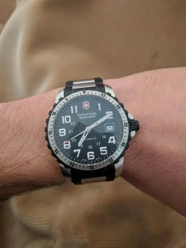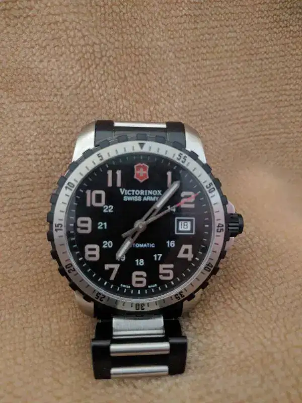 Hola os presento mi nuevo Victorinox automático, con una caja pequeñita de 41 mm y un aspecto entre seriedad y juvenil que es lo que mas me ha gustado desde que lo vi. Se que es un modelo antiguo descatalogado ya (eso es lo de menos) pero me trae una duda, leyendo en este foro sobre relojes automáticos he visto que no es bueno que están parados mucho tiempo por el tema del aceite, por lo que entiendo que el vendedor lo ha tenido guardado un tiempo parado (lo he comprado en amazon) mi pregunta es si le vendría bien visitar al relojero para una puesta a punto y en el caso donde llevarlo, soy de Huelva y he visto que aquí no hay buenos relojeros, por lo que pienso que podría enviarse a algún relojero de confianza.
