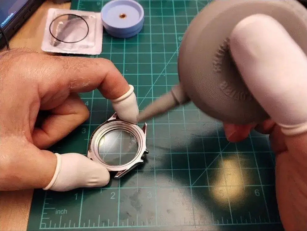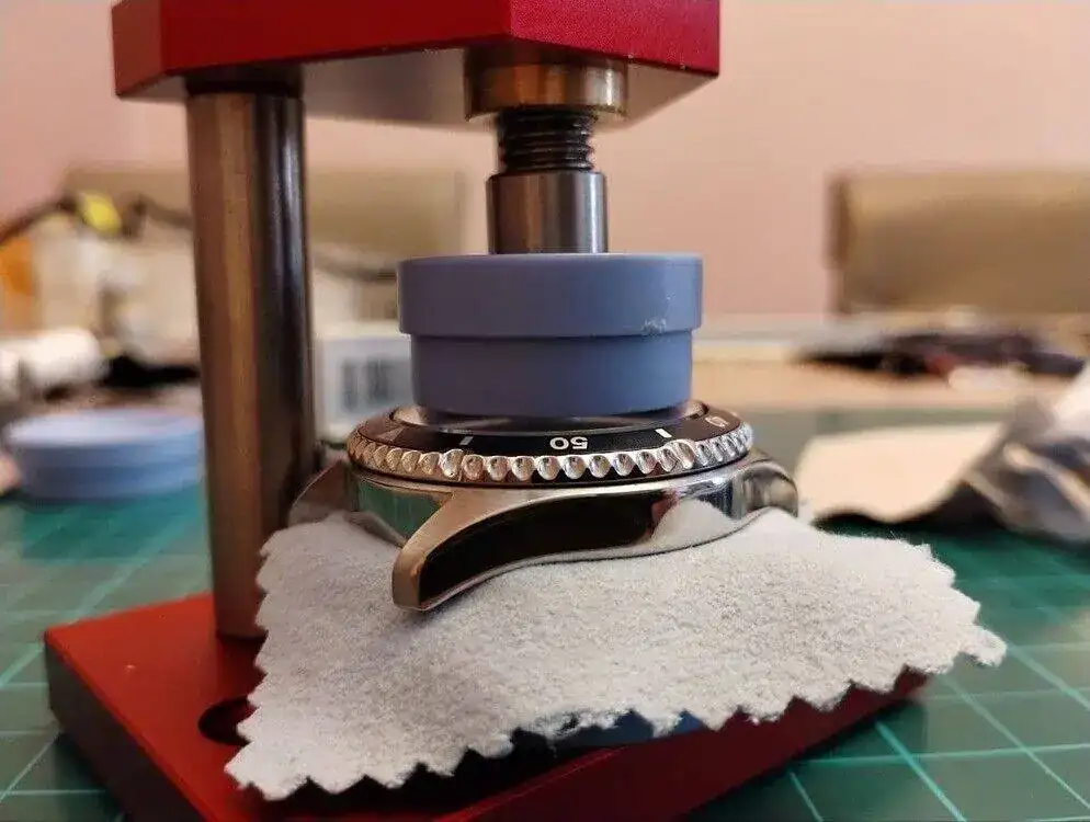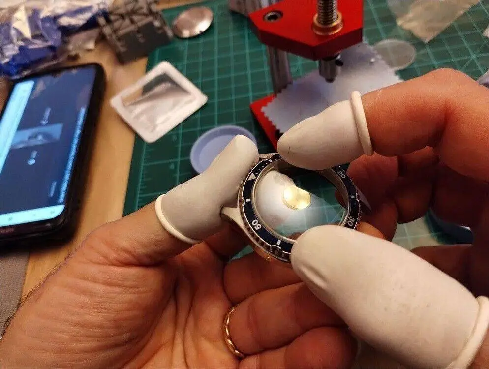 No era la primera vez que lo hacía, porque ya le había puesto un zafiro con doble parábola al Casio Marlin (después de haberlo llenado de aceite), lo que resalta aún más el efecto visual de estar lleno de líquido.