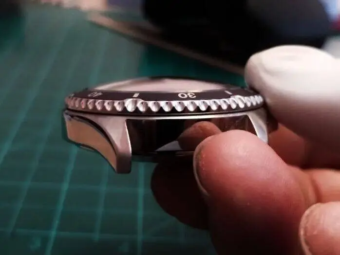 Aquí, puede apreciarse perfectamente como sobresale el zafiro, pero está perfectamente alineado. Además, ha habido suerte, de que su curvatura coincide muy bien con la del bisel, y casi con las garras.