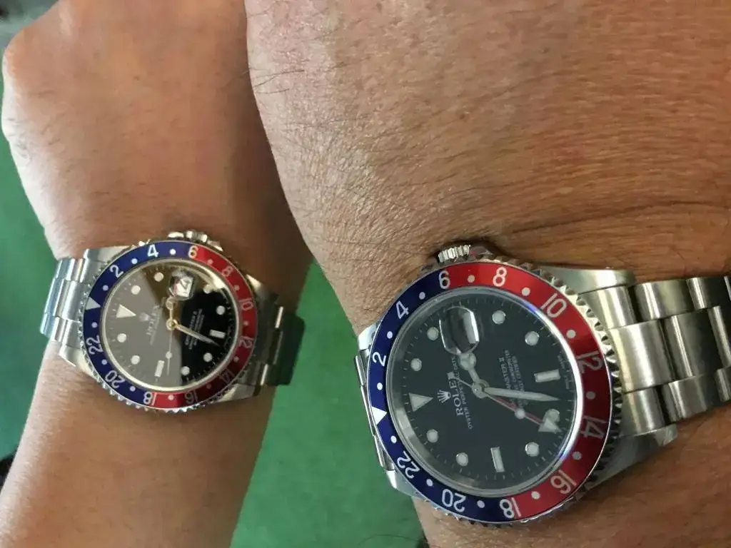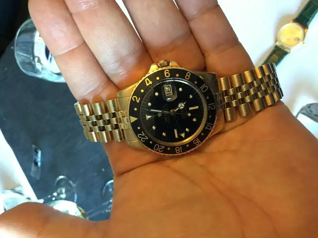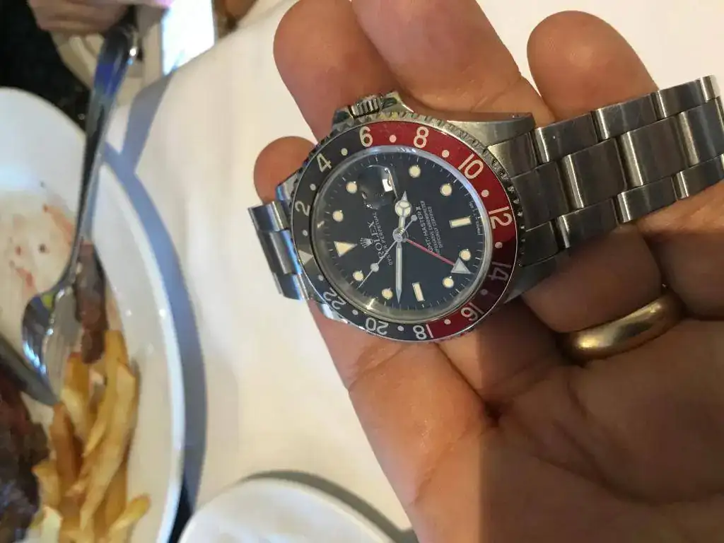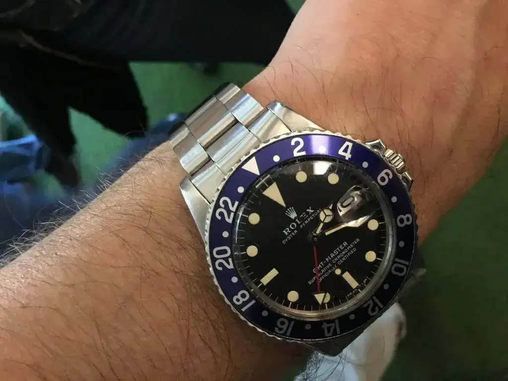 Y en la otra muñeca de este célebre forero, un GMT Master 1675 con el deseado bisel Blueberry. Nótese la tonalidad de los índices tipo palletoni: