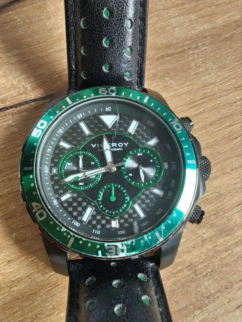 El negro y verde fue el primer reloj que me compré con mi dinero en la época de chaval en el instituto, y como se puede ver, le di un uso trotero y con cero cuidado como buen joven que le daba igual. Una pena.