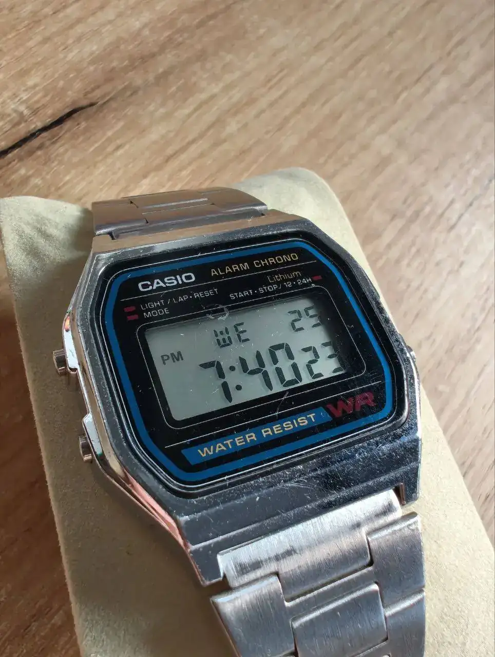 Casio que me compró mi padre cuando estaba en el colegio. Fuimos al pueblo a ver a mis abuelos y un dia fuimos a comer bacalao a un pueblo Portugués cerca de la frontera, Chaves. Alli mientras estabamos comiendo si no recuerdo mal se nos acercó un señor a ver si queriamos algun reloj, a mi me debió de gustar y mi padre me lo compró.