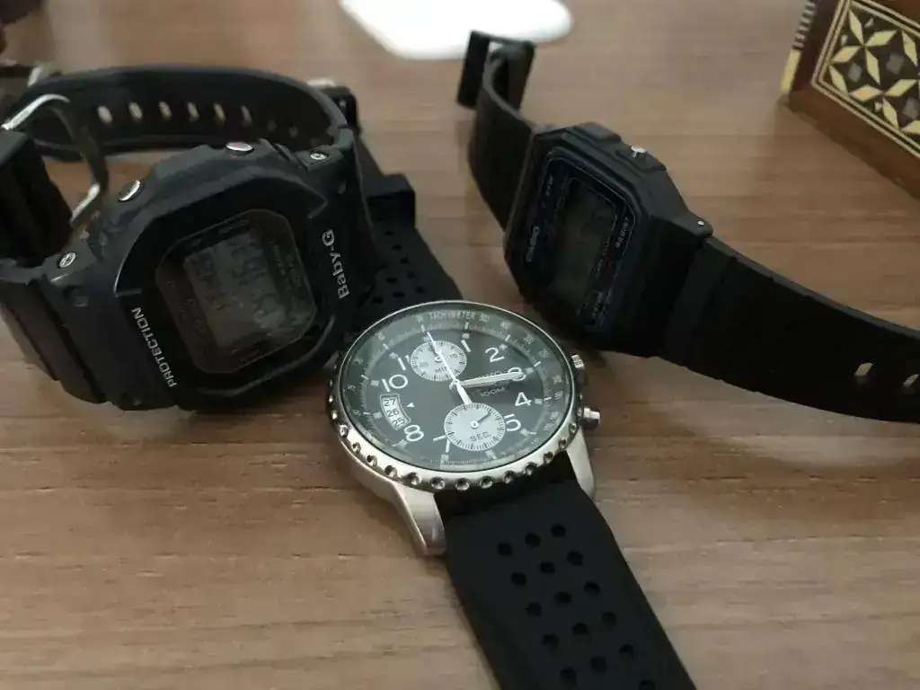 Habéis visto en la foto anterior del seiko que está rodeado del Casio F91W que siempre he tenido y que hoy en día utilizo al estar en casa y para dormir (por su alarma con la que me despierto cada mañana) y también un casio baby g para hacer deporte (cada vez menos, debido a los dos churumbeles). Son relojes duros, fiables y que te dan mucho por lo poco que cuestan.
