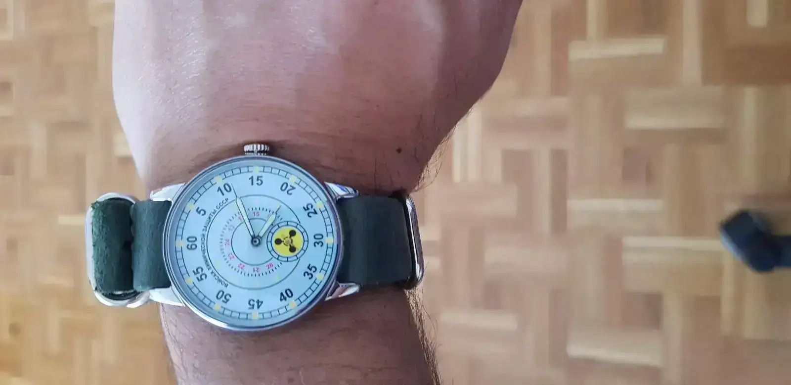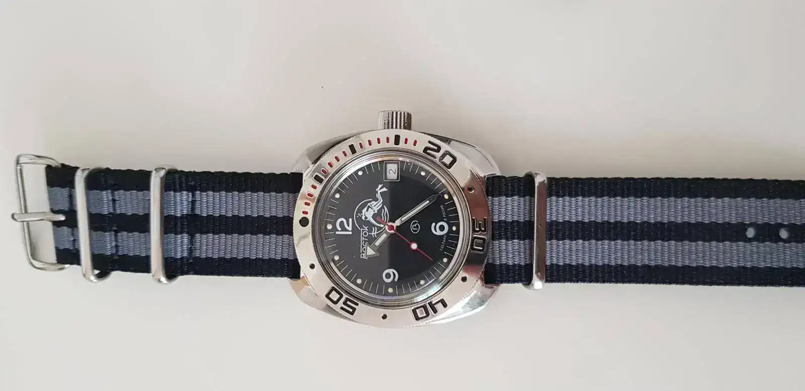 Lo pedí directamente en Komandirskie. Pero tardaba mucho en llegar, así que por el camino me hice con un Poljot 3133, mas bonito si cabe que el Vostok. No os pongo ahora la foto de como queda con la NATO verde ya que lo tiene Herminio en una revisión, pero si la primera que le hice cuando me llegó