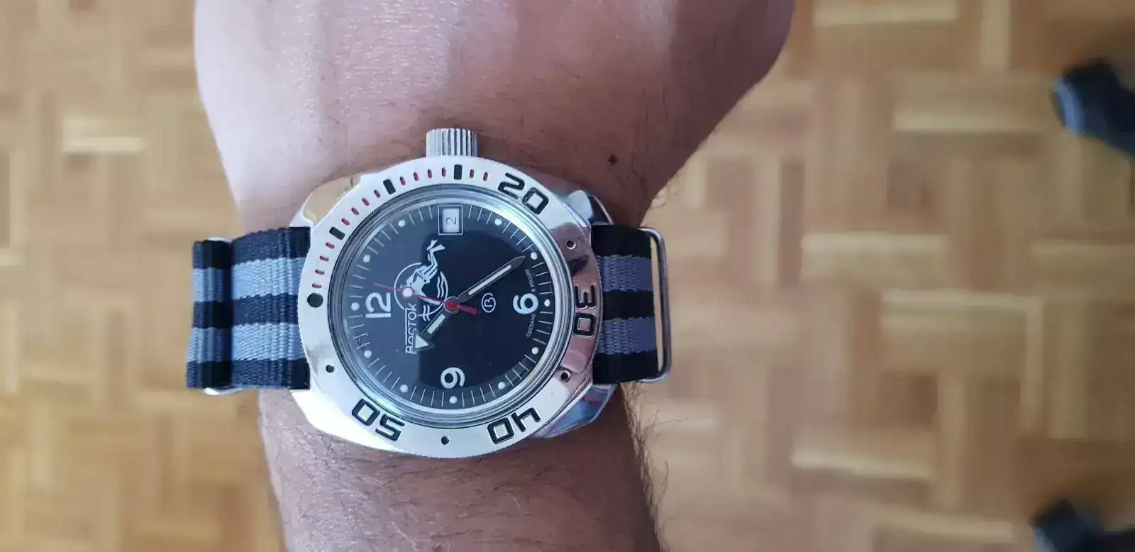 Años después, más o menos a finales del 2019, llegó la debacle. Descubrí los relojes rusos de casualidad, por un amigo. Yo ni siquiera llevaba reloj en ese momento!. Pero me encantaron. Así que empecé a interesarme y descubrí el foro (y mi cuenta corriente lo notó…). Esta fue mi “primera pieza”, un clásico, Vostok Amphibia, bonito donde los haya. Y duro.