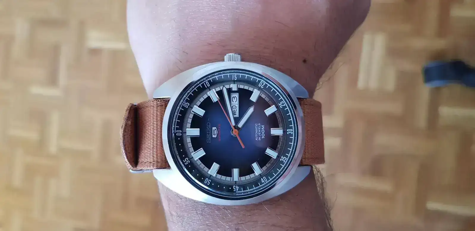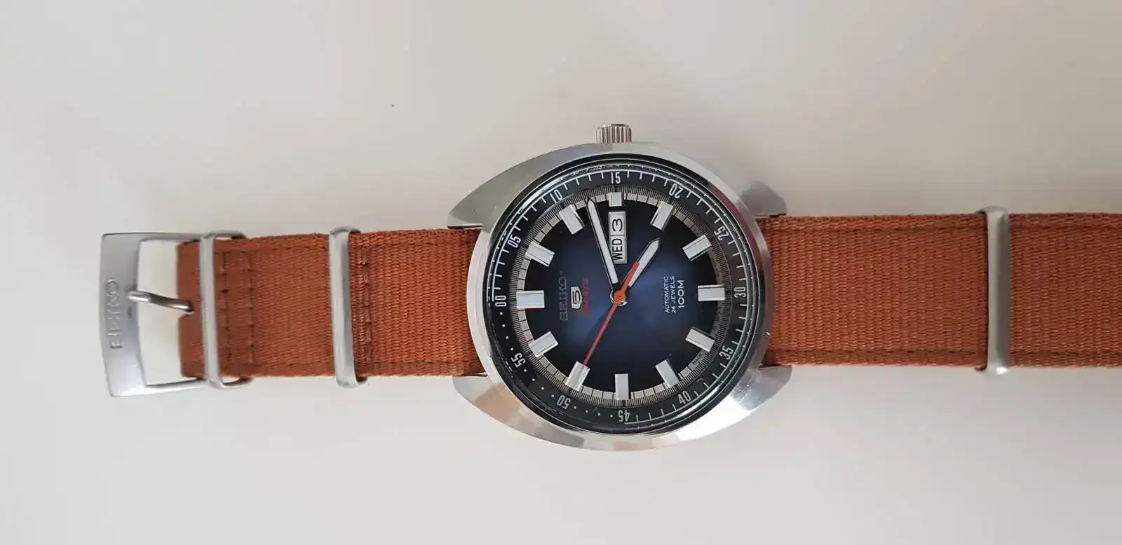 Y seguí investigando el foro… maldición! Y descubrí que había mundo aparte de los rusos, me hice listas de relojes que me gustan, miraba en tiendas, y… cayó el siguiente: un Seiko 5 SRPB21J1 que me enamoró. Me costó conseguirlo, al final lo encontré en EEUU de segunda mano. Y aquí está. Muy bonito. Y mi primera decepción. Me parece demasiado grande para mi muñeca. No sé si me desharé de él o esperaré a acostumbrarme…