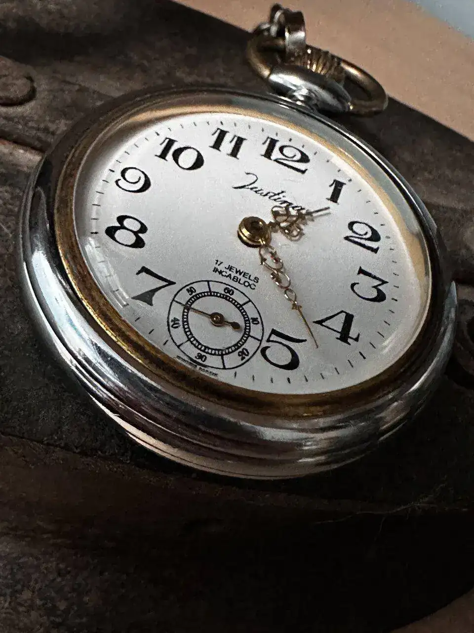 Lo compre yo en el año 1987 y lo utilice unos cuantos años, como reloj de diario. En aquella época, pre telefonía móvil, donde el uso habitual era el del reloj de pulsera y el boom era el reloj digital Casio, yo me decante por el de bolsillo tradicional. Y me decidí en aquella relojería de la plaza de España de Valladolid, por este Justina de esfera blanca y agujas doradas, ¿Luis XV? del fabricante de Dueñas (Palencia). Y no hice esto, pensando en la marca, ni en la estética, el tamaño, etc. se porque lo hice. Era el que podía pagarme.
