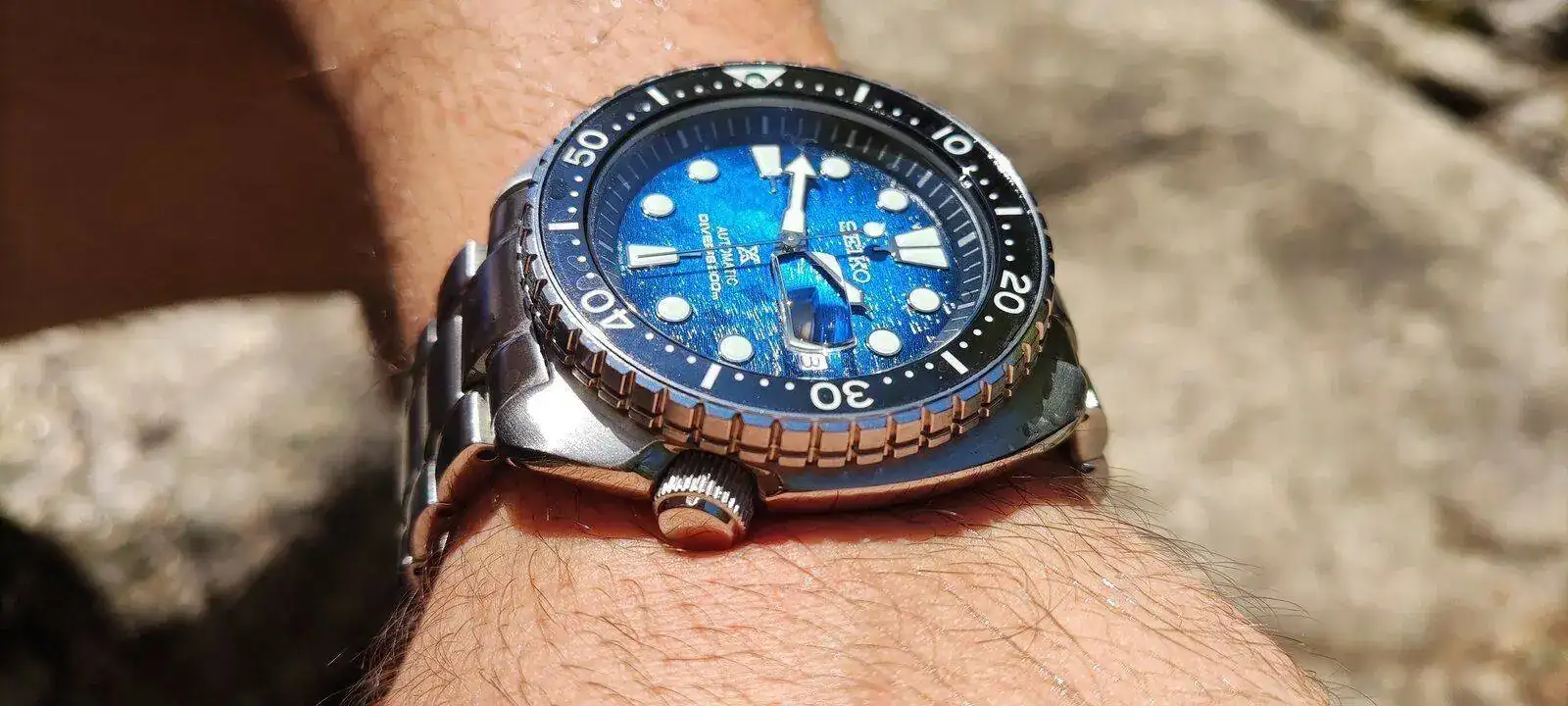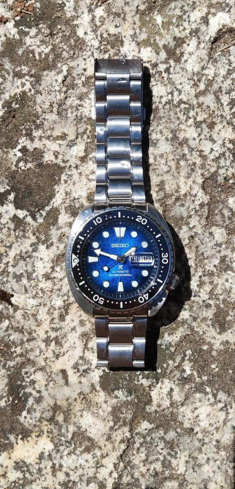 Se trata de un Seiko King Turtle Manta Ray, con las nuevas mejoras de este año: bisel cerámico y cristal de zafiro, principalmente. El resto de elementos se mantienen: movimiento 4R36 con reserva de marcha de 41 horas, parada de segundero, corona roscada a las cuatro y su famosa robustez. Cómo apunte, mi reloj está en +3 ahora mismo (aunque probablemente sea algo más ya que todavía estoy perfeccionando el tema de la medición).