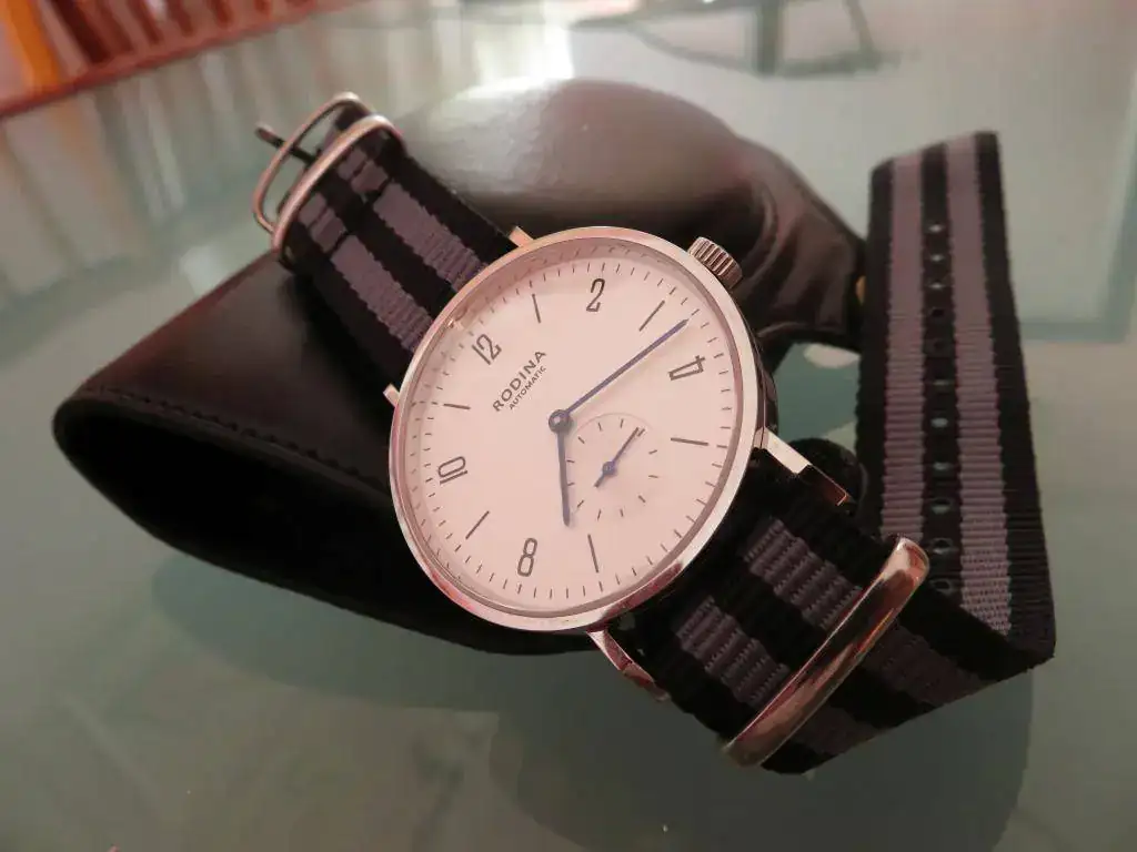 Mientras se aclara si sale o no sale un Nomos RE, pues he decidido hacerme con este pequeñín a ver qué tal me va el tamaño y el estilo. El ratito que lo llevo puesto, con camisa, me está gustando mucho. El tamaño 38mm creo que es el mío (antes pensaba que sería el 35mm), pues aunque las asas me sobresalen un poquito, la esfera rellena el espacio justo de muñeca.