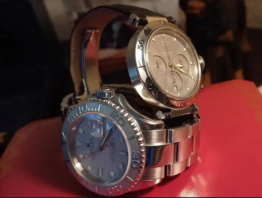 Los dos hermanos de acero, que tienen en comun el bisel de platino, el Rolex Yachtmaster tambien la esfera.