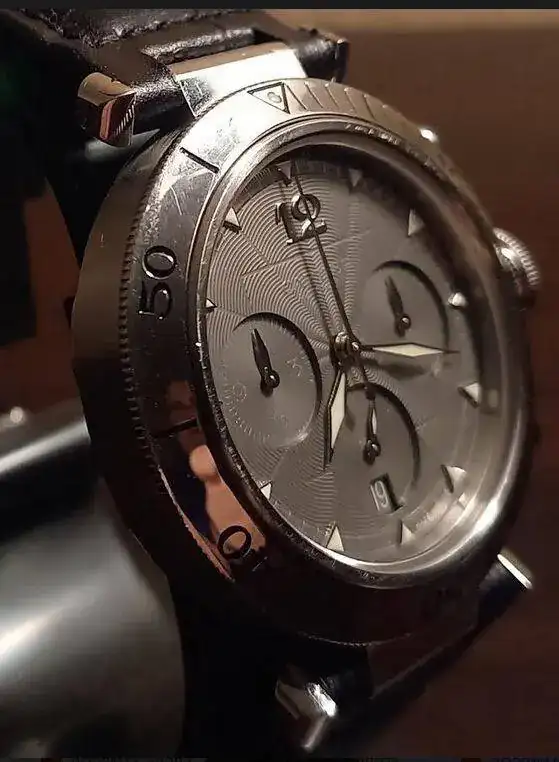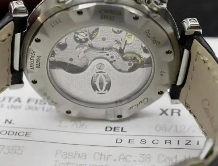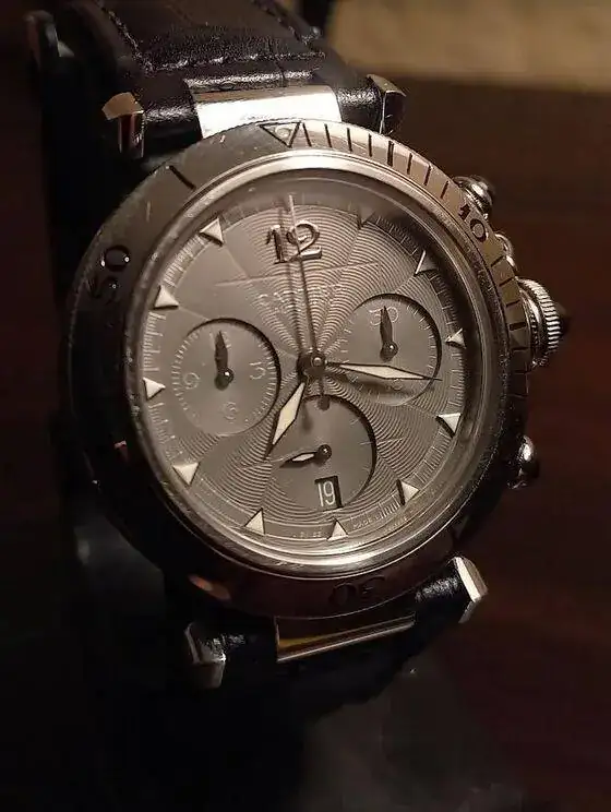 Por fin encuentrado un Pasha que tiene todo que megusta, una serie muy limitada por el cambio de milenio, cronografo con el calibre F.Piquet 1185, caja de acero con el bisel de platino, esfera oscura con guilloche, correa de cocdrilo con hebilla. Tiene todo el FULL SET hasta la factura del anos 2002, vendido en Italia. Creo es una "safequeen", parece un reloj casi nuevo y lleva la primera correa de casa.