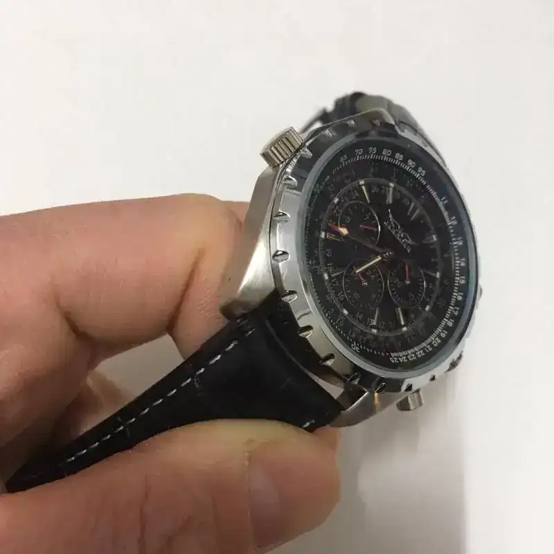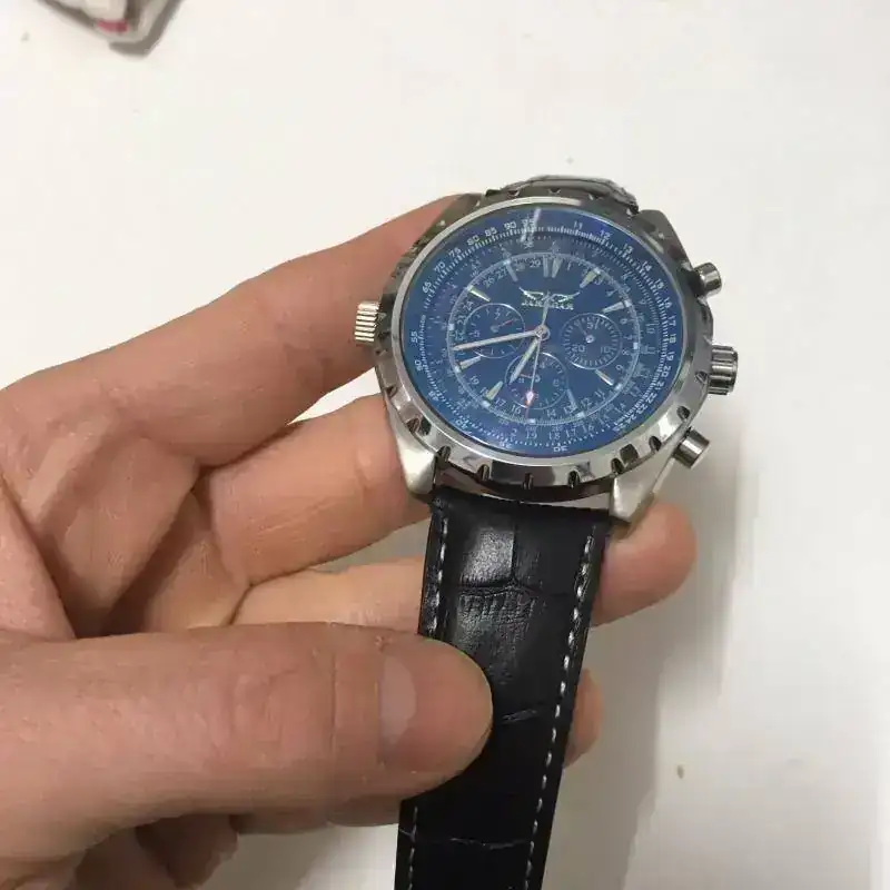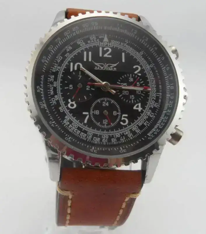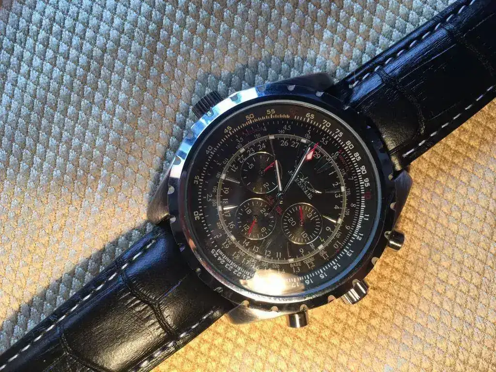 Y para iniciarme en esto he decidido empezar por uno bien grande y bastante fuera de mi estilo habitual: el Jaragar Aviator A212. Un reloj de 48 mm de diámetro (mi calibre indica 49 mm) que rinde homenaje al estilo "Breitling" y que ha resultado ser una enorme sorpresa en lo positivo. Pese a que su tamaño parece incompatible con mi muñeca de 17,5 cm lo cierto es que me ha resultado comodísimo este primer día de uso continuado. A su llegada únicamente el cromado me disgustó, porque en una caja tan grande le daba un aspecto de plástico un poco decepcionante. Así que cogí un poco de scotch-brite y sin desmontar la caja ni la correa traté de ser muy cuidadoso para darle un acabado cepillado. Eso hizo que para mí cambiara totalmente su aspecto.