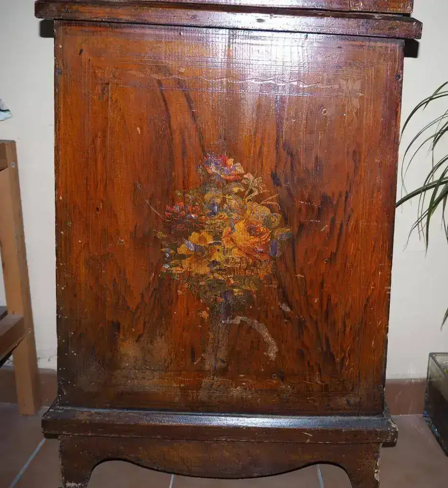 El mueble del reloj fue mutilado en su puerta de acceso al péndulo y contrapesos para hacerle una "ventana" más grande y convertir esa parte en mueble estantería
