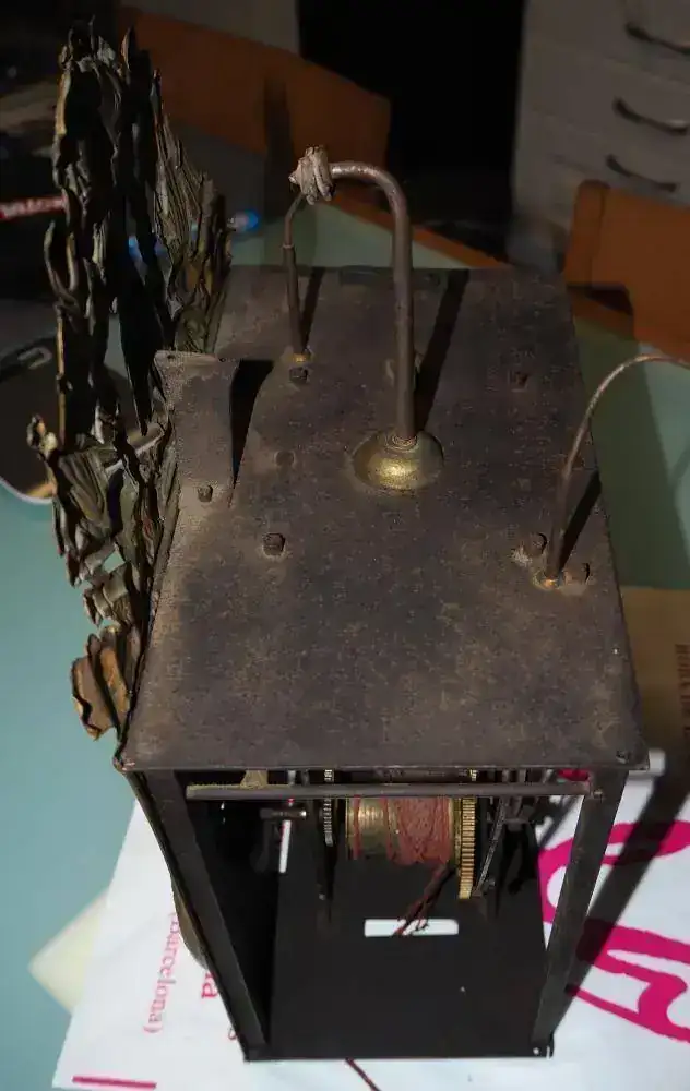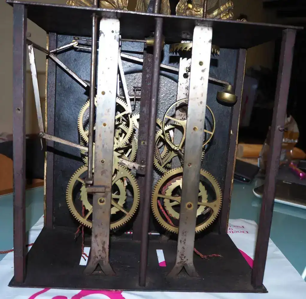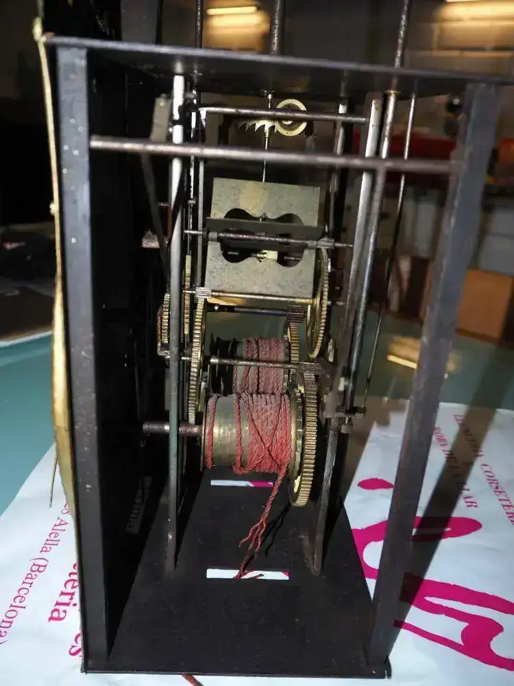 Hoy he ido a buscarlo después de un buen viaje de casi dos horas (gasoil y peajes...) y cuando lo he visto en directo se me ha venido el mundo abajo... El movimiento no tiene ninguna tapa (no se veía en las fotos) y después he visto que le colgaba alguna pieza en el grupo de la sonería y le faltaba la campana, pesas y péndulo (estas dos últimas cosas ya lo sabía).