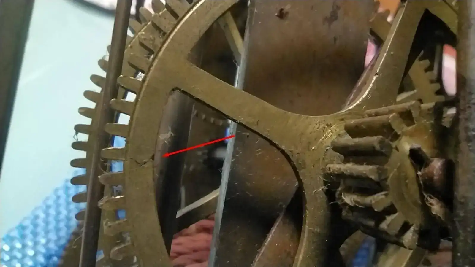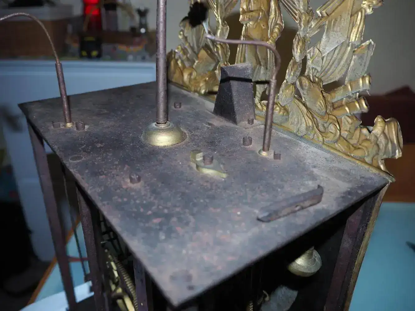Una vez en casa, visto con más calma y mejor luz, he visto que el latón ha sido pintado con pintura color dorado sin mucho esmero (han pintado un poco la esfera), el eje de la campana estaba doblado en su base y en la punta... he enderezado la zona de la base pero me ha cedido al final de la manera que ceden los metales a punto de romperse (