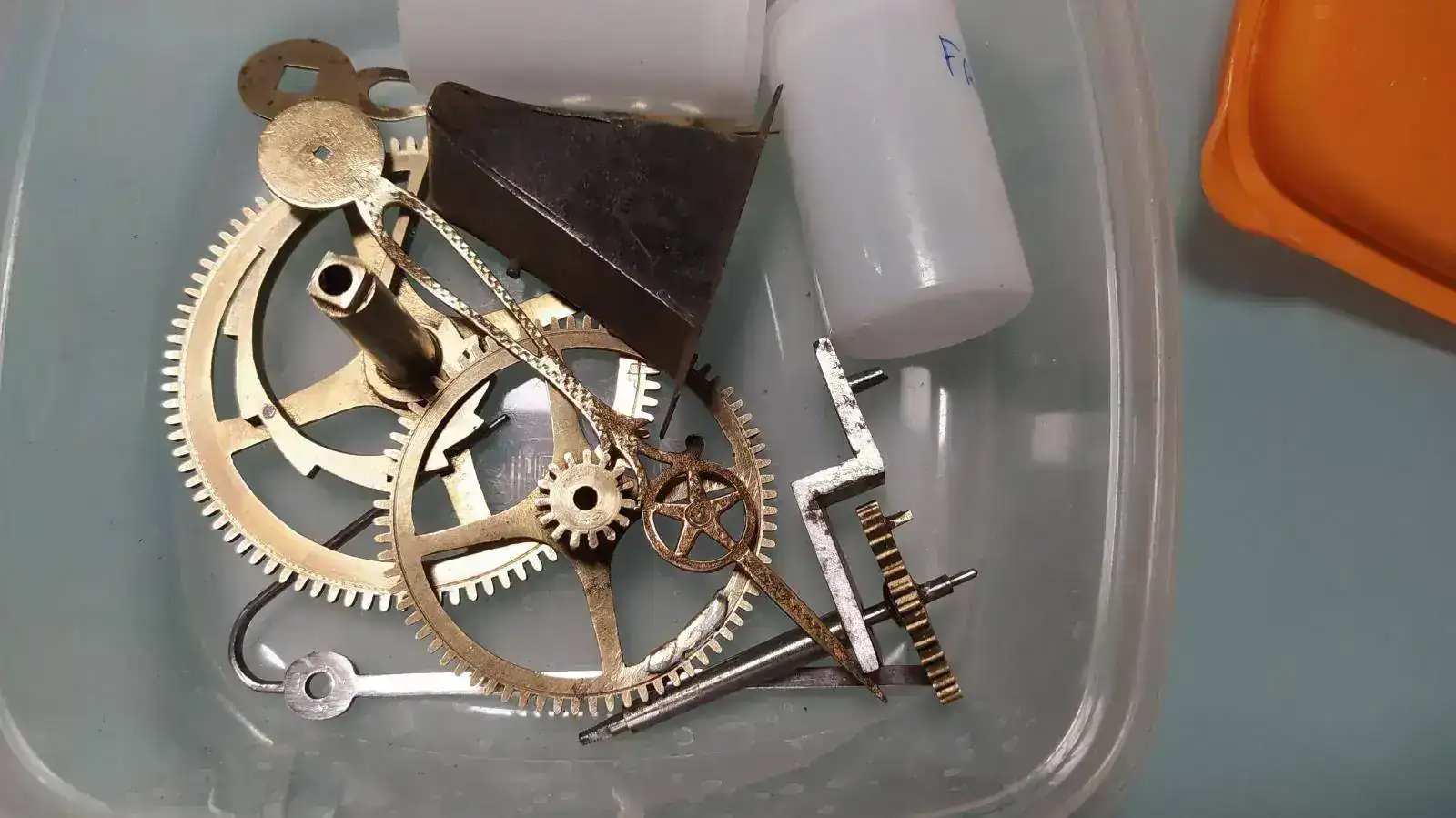 También he limpiado todos los engranajes de latón tal como me recomendasteis, con una mezcla de agua, fairy i un 40% de amoníaco aprox... Difícil de tratar con ese porcentaje el amoníaco, lo tuve que acabar haciendo en el patio. No era fácil y quizás deberían haber quedado mucho más brillantes, pero mejor que antes están...