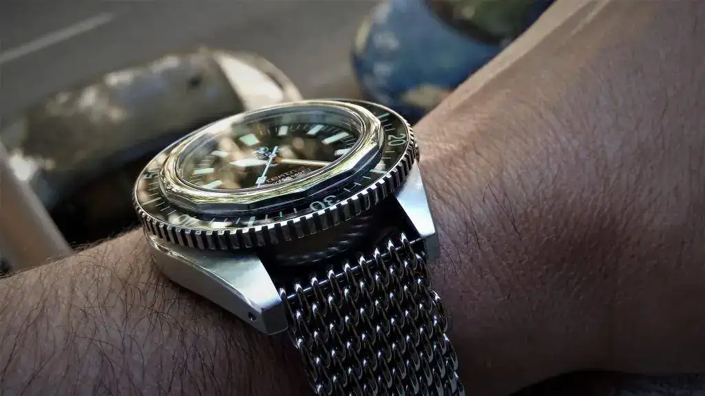 Lleva milanesa y el cierre es muy flojito...respecto al conjunto del reloj, pero esto tiene muy fácil solución... A la espera estoy de su caucho original, disponible en la misma Crepas (su trato con el cliente, por ahora exquisito) que además resuelve los problemas que hubo al parecer en su primera tirada de fabricación. Resumiendo, creo que la relación calidad-precio es excelente por un reloj de esta configuración y yo estoy encantado con él!!!