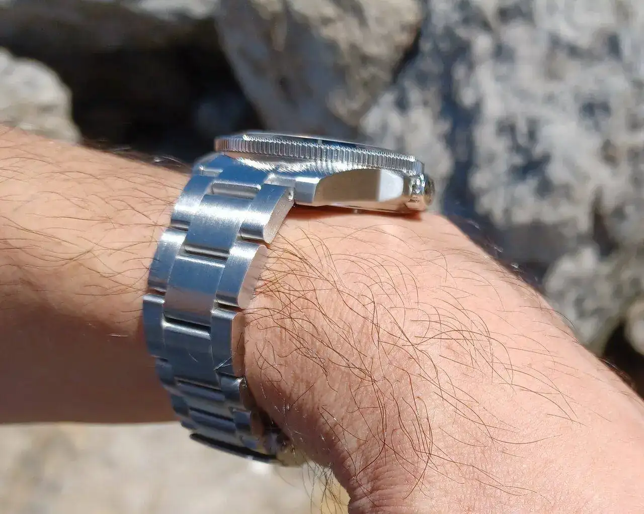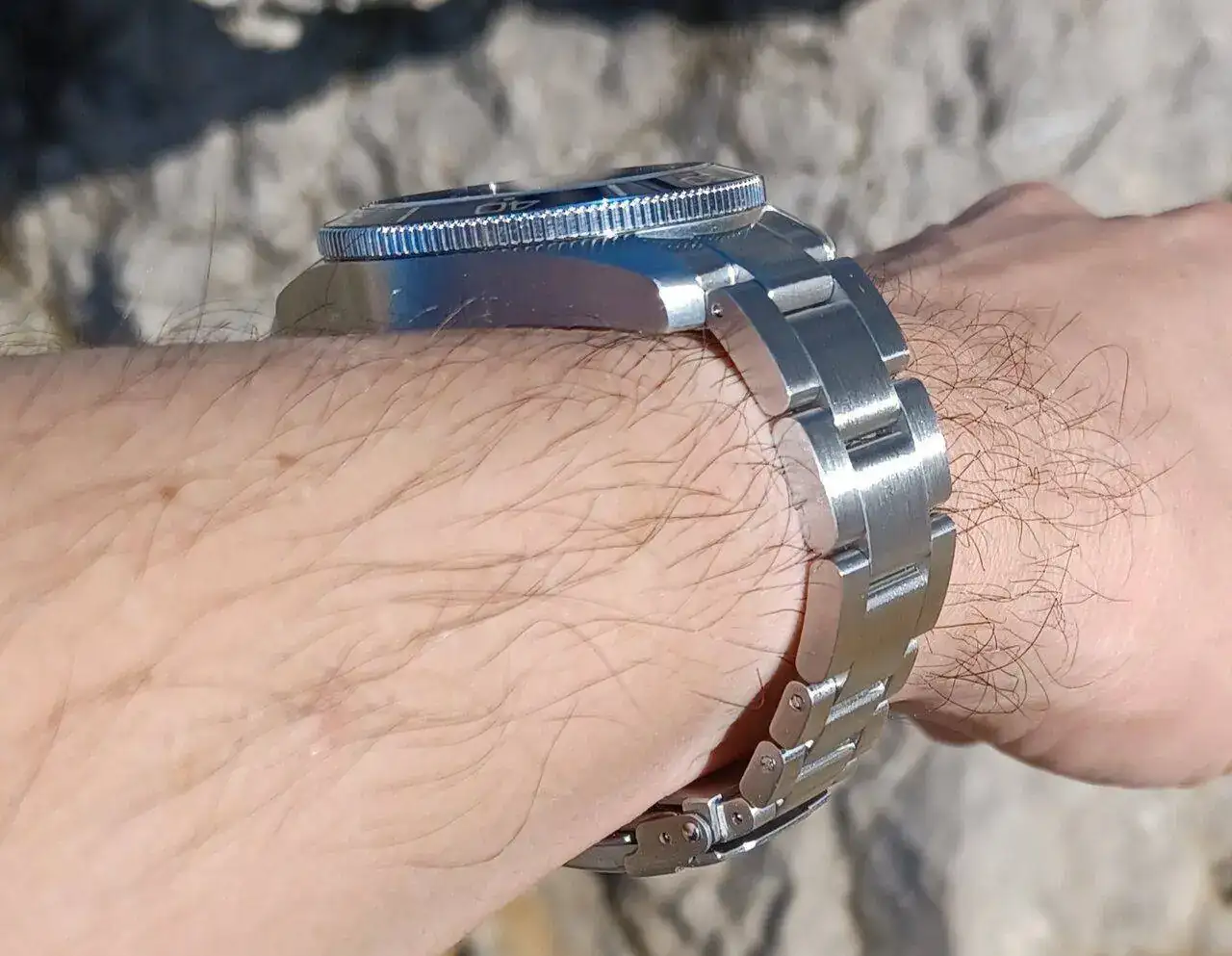 No pesa demasiado pero se nota al ponerlo, y es una sensación agradable. Asienta bien, lo llevo muy cómodo, la caja no se mueve, es como si se pegara a la muñeca por su peso y el perfecto ajuste del brazalete que se consigue, en mi caso con tres eslabones menos y un microajuste hacia dentro.