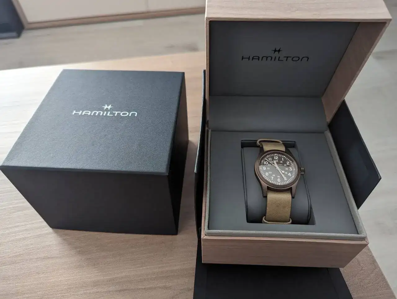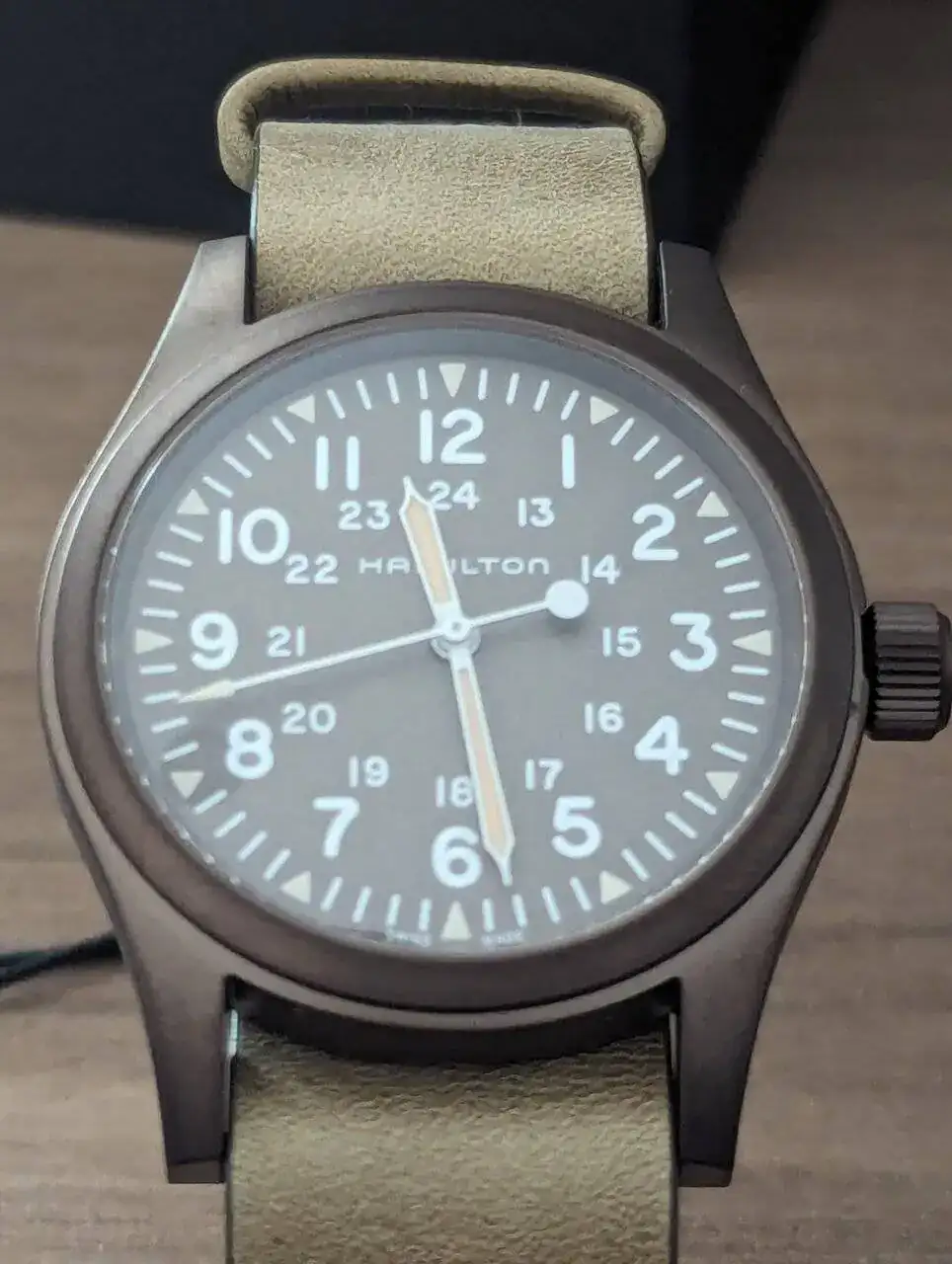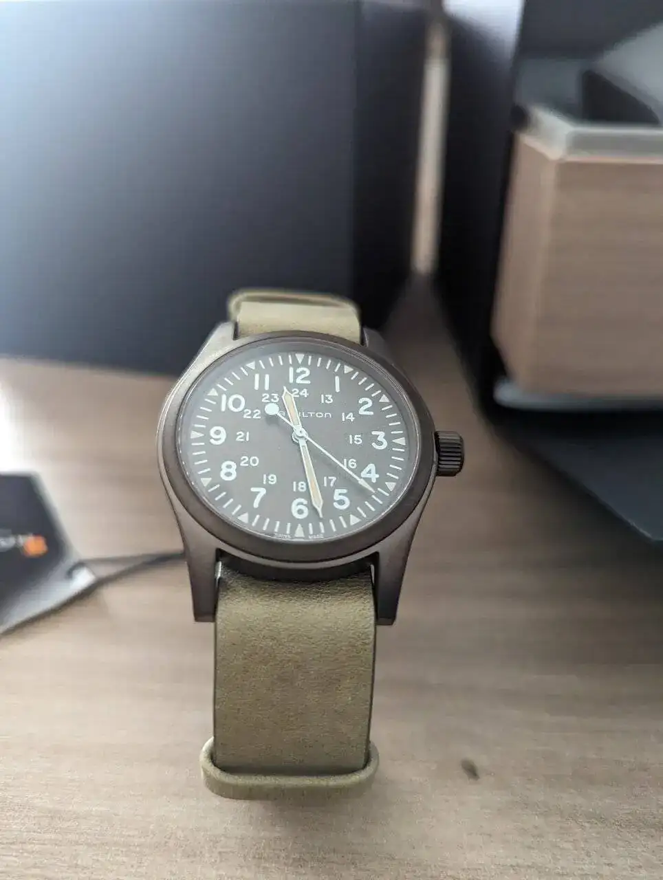 El otro día, indagando por la red, encontré una unidad a buen precio del reloj que llevaba un tiempo llamando a mi puerta, el khaki field 38mm, especialmente el que viene con recubrimiento pvd tierra, el reloj militar que quería añadir a mi colección.Aquí donde yo vivo no había ninguna unidad en stock que pudiera probar en mi pequeña muñeca de 16,5 cm y me daba un poco de miedo que la larga distancia entre postes no se adaptará bien. Acabo de recibirlo y he de decir que en persona gana mucho. El tema del AR es algo a lo que no doy mucha importancia pero entiendo que haya gente que le tire para atrás, con esta unidad te llevas la doble funcionalidad, reloj y espejo todo en uno XD. De momento sólo lo he visto en casa, a la tarde daré un paseo, en un día soleado como hoy para apreciarlo mejor! Es verdad que la combinación perfecta para mí era con la correa nato verde, pero a 500€ con la de piel (teniendo el cuenta el precio de esta unidad hoy en día) he decidido cogerlo y el día que haya stock de la nato(con la hebilla tierra) pedirla por los 55€ extra que cuesta. Os dejo por aquí unas fotitos del unboxing y primera puesta. Especial mención y agradecimiento a la tienda que me lo ha enviado con el mimo que vais a ver y en menos de 24h puesto en casa! Feliz día a todos!