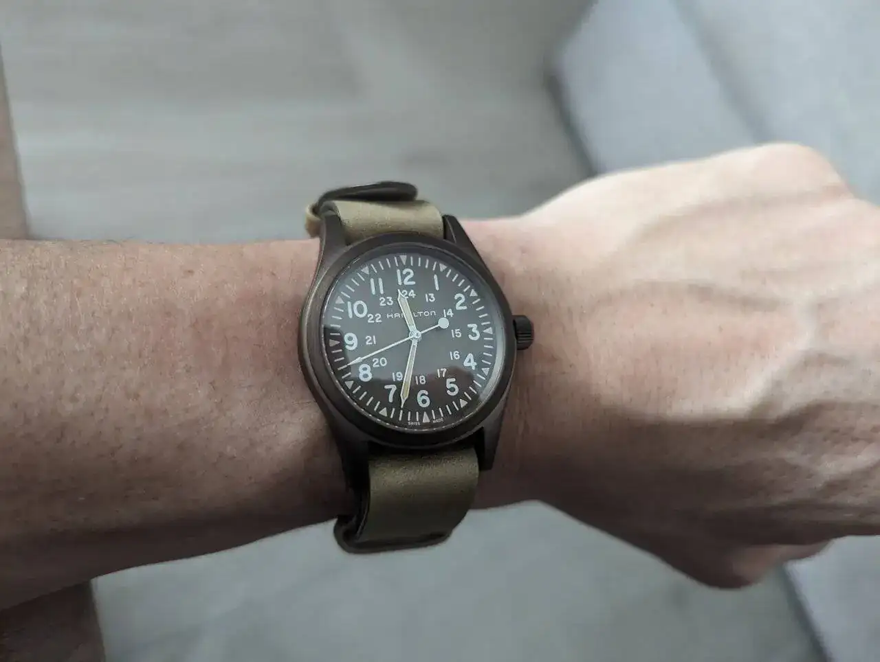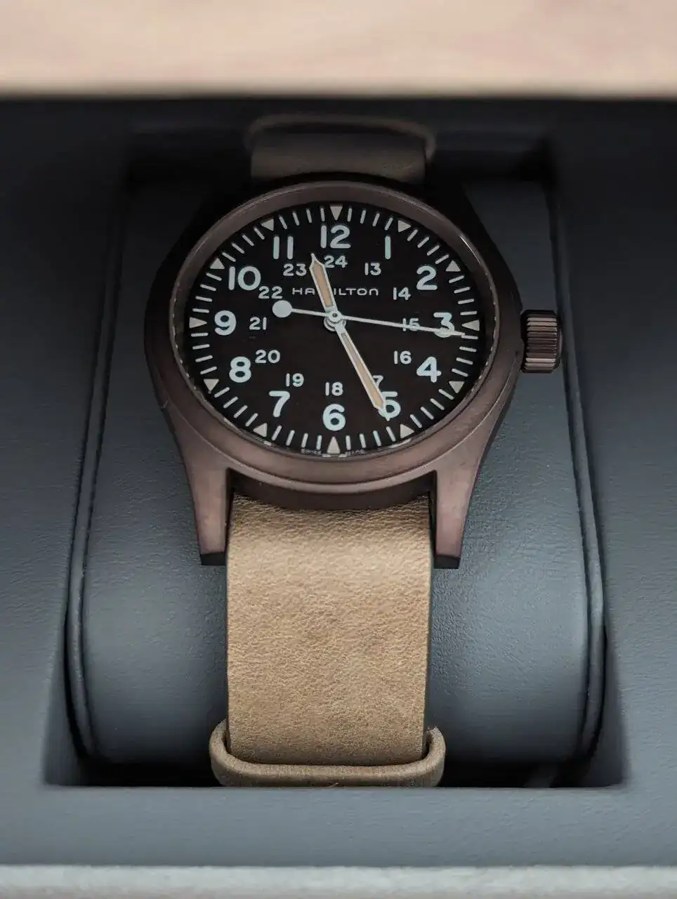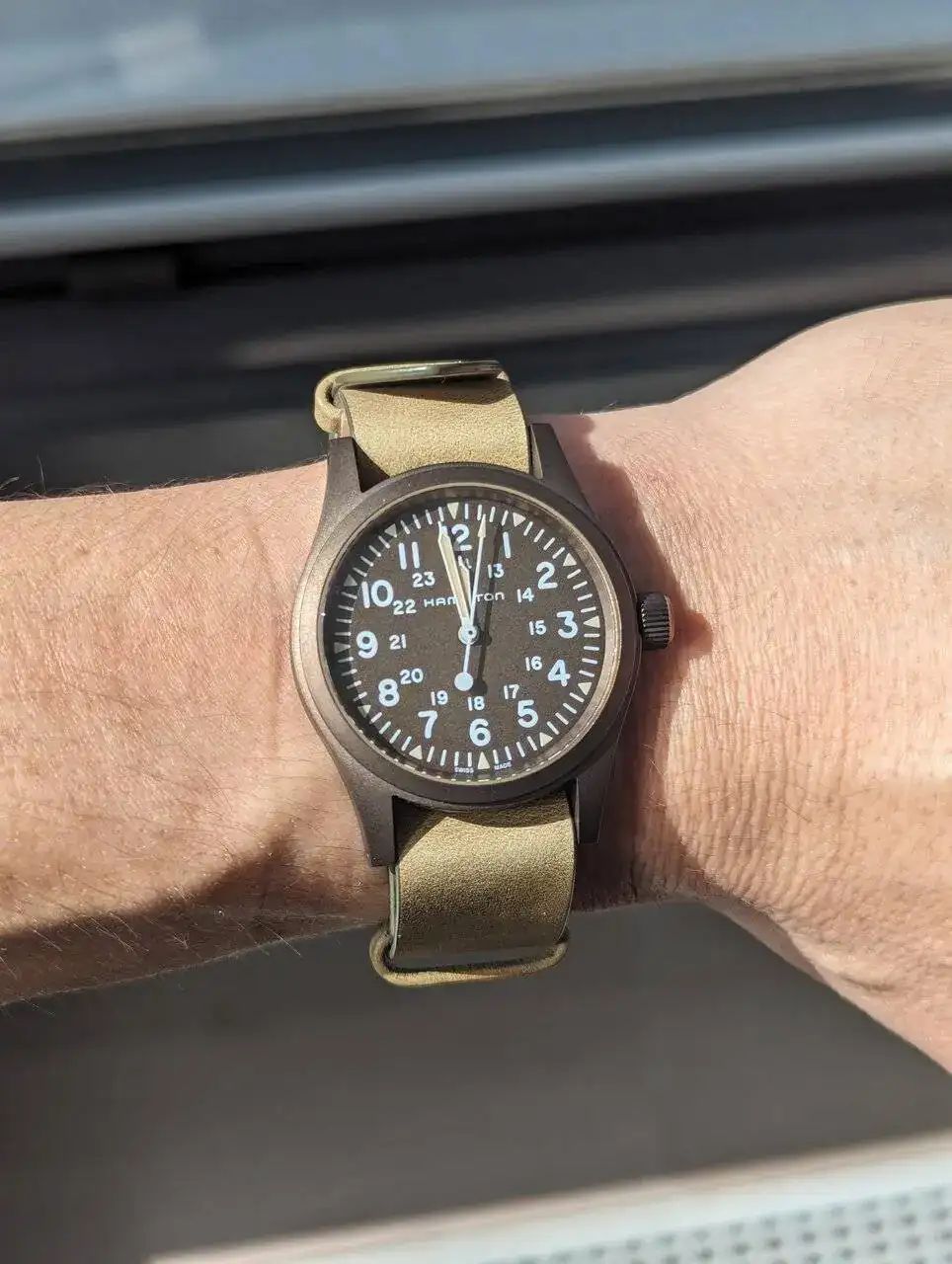 El otro día, indagando por la red, encontré una unidad a buen precio del reloj que llevaba un tiempo llamando a mi puerta, el khaki field 38mm, especialmente el que viene con recubrimiento pvd tierra, el reloj militar que quería añadir a mi colección.Aquí donde yo vivo no había ninguna unidad en stock que pudiera probar en mi pequeña muñeca de 16,5 cm y me daba un poco de miedo que la larga distancia entre postes no se adaptará bien. Acabo de recibirlo y he de decir que en persona gana mucho. El tema del AR es algo a lo que no doy mucha importancia pero entiendo que haya gente que le tire para atrás, con esta unidad te llevas la doble funcionalidad, reloj y espejo todo en uno XD. De momento sólo lo he visto en casa, a la tarde daré un paseo, en un día soleado como hoy para apreciarlo mejor! Es verdad que la combinación perfecta para mí era con la correa nato verde, pero a 500€ con la de piel (teniendo el cuenta el precio de esta unidad hoy en día) he decidido cogerlo y el día que haya stock de la nato(con la hebilla tierra) pedirla por los 55€ extra que cuesta. Os dejo por aquí unas fotitos del unboxing y primera puesta. Especial mención y agradecimiento a la tienda que me lo ha enviado con el mimo que vais a ver y en menos de 24h puesto en casa! Feliz día a todos!
