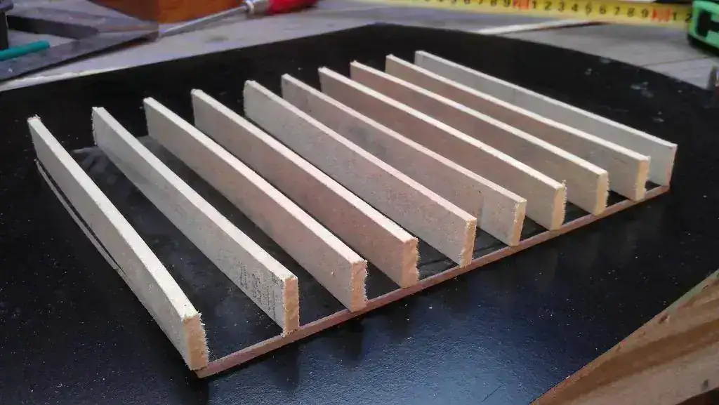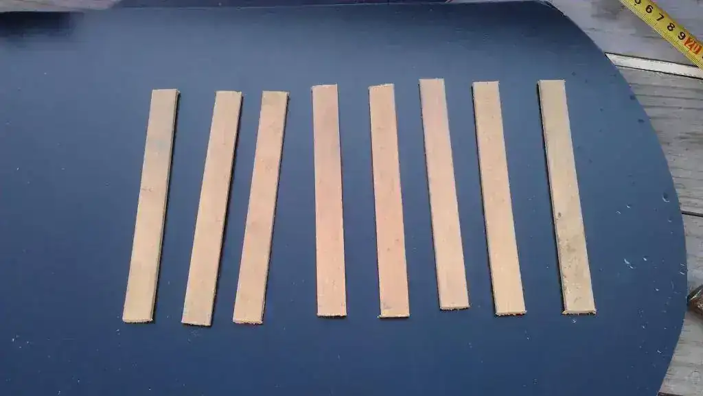 Luego corté una larga tira de madera en pequeños trozos para hacer las divisiones, y las presenté para ir teniendo una idea de lo que saldría del experimento.