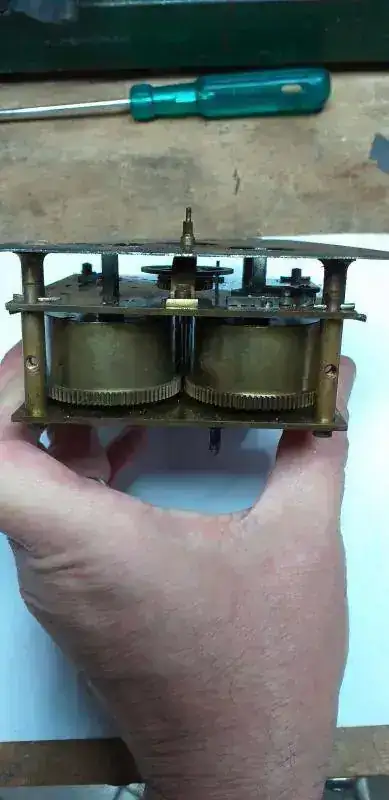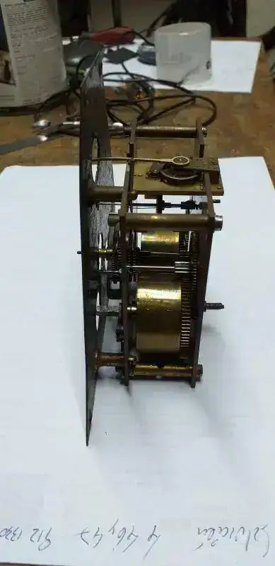 No encontre ninguno igual, aunque algunos similares. Tengo un amigo en Cordoba capital, que su papa es relojero, y le dije que no desarmaba nada mas de lo poco que habia hecho, porque me saltaba una cuerda, o se me salia un engranaje, y se lo tenia que mandar por correo y que me lo repare. Me aconsejo que si no lo desarmaba y lo repasaba para ver si tenia algo para reparar, que simplemente le diera cuerda, sumerja la maquina en aguarras de muy buena calidad (se evapora bastante rapido y no deja restos grasos), la vaya girando cada 2 o 3 dias, y luego la sopleteara con aire a muy baja presion, que era la mejor para hacer sin saber nada del tema. Luego comprara aceite de maquina de coser de buena calidad, y le colocara en cada buje, engranaje y eje, una gota de lubricante que levantara con la punta de un alfiler en forma vertical, para que cargara la menor cantidad posible. Luego le diera cuerda y fuera probando si se detenia por otro motivo que no fuera falta de cuerda.