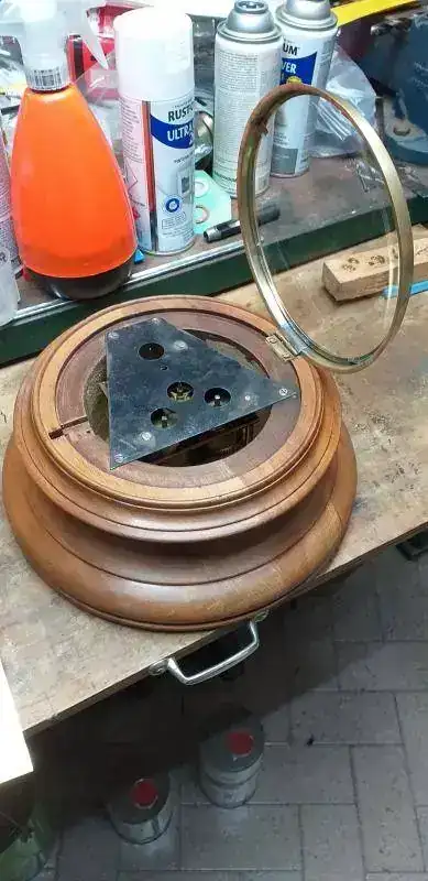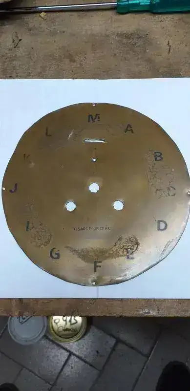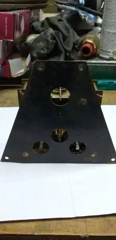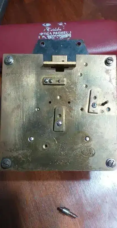 Luego me dedique a reacondicionar la tornilleria de hierro (limpiar y rehacer las muescas del destornillador plano en la fresa), la bisagra (limpieza, enderezado y pulido grueso), la traba del aro/puerta de bronce (limpieza con acido cromico y lana de acero extra fina, enderezado y pulido grueso), vidrio concavo (limpieza con soda caustica y rasqueta), aro y sub aro de la puerta (limpieza con acido cromico y lana de acero extra fina, enderezado y planchado, pulido grueso), los tres ojales para colgar y fijar (limpieza con acido cromico y lana de acero extra fina, enderezado y planchado, pulido grueso). Tambien reemplace las tres clavijas que sujetan la maquina, a la platina de hierro que sujeta el mecanismo completo, a la caja de madera, y enderece y limpie con cepillo de acero muy fino (de Dremel), la platina de acero.