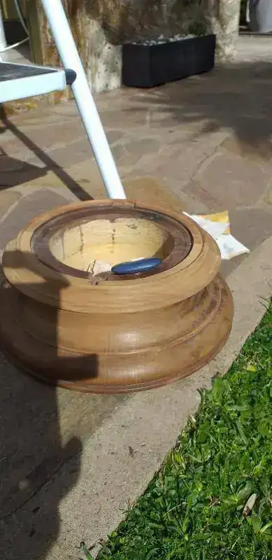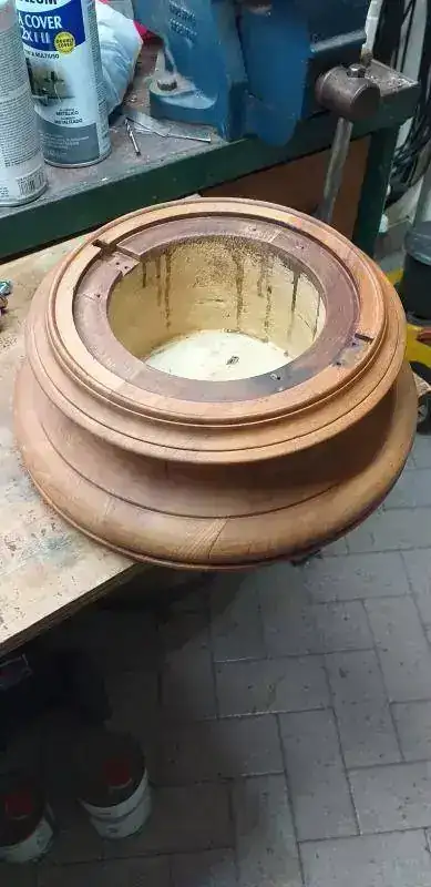 Luego continue con la caja de madera, que es la parte que tengo experiencia y por lo que lo compre. Tenia una mano de alguna laca o barniz transparente, y en la parte trasera algo con color rojizo de medio tinte (ni muy traslucido, ni muy opaco). Utilice una hoja de cuter nueva (fundamental el estado de su filo, para el ejercicio de rascado por abrasion, y no provocar el efecto de patinado o pulido de la madera) para los planos, y para las molduras semi circulos ya sea en relieve o en depresion, realice con hojas de sierra viejas de acero rapido (que guardo y utilizo en el torno de metal para cortar metales blandos o plastico), sendas rasquetas con discos del mini torno DREMEL (modifico los discos de piedra con un diamante para darles la forma deseada). En la primer foto, se puede apreciar que el interior de la caja de madera, tiene pintura color amarillo muy claro, que inicialmente pensé en quitar, pero que por motivos estructurales no lo hice. Hago una aclaracion respecto a esto. Las maderas SIEMPRE tienen movimiento, sea cualquiera su calidad, origen, tiempo de muerta (o seca como se dice normalmente), ubicacion, exposicion, etc. Todo influye en su comportamiento diario, y considere que si la caja de madera, que esta conformada por varias maderas unidas, se mantenia en su forma, sin grietas ni rajaduras, NO LA TENTARA A ALTERARSE, y por ello deje la pintura amarilla interna. Resultados: