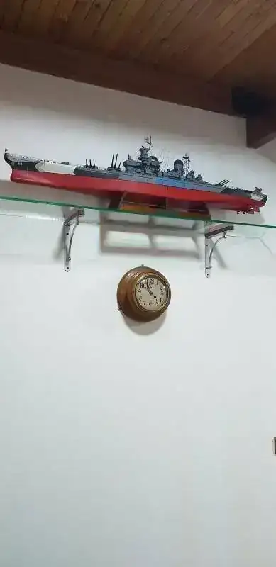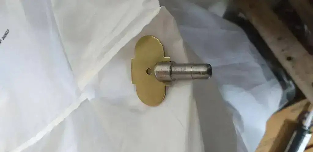 continue construyendo la llave para dar cuerda, que no la tenian. Averigue en internet, las vendian, pero no queria esperarla y la fabrique con 2 pedazos de angulo de hierro, que corte y solde segun necesidad, luego repase en el torno, y le aplique la base de bronce de un tirardor de puerta que cambie del mueble de mi casa. Resultado: