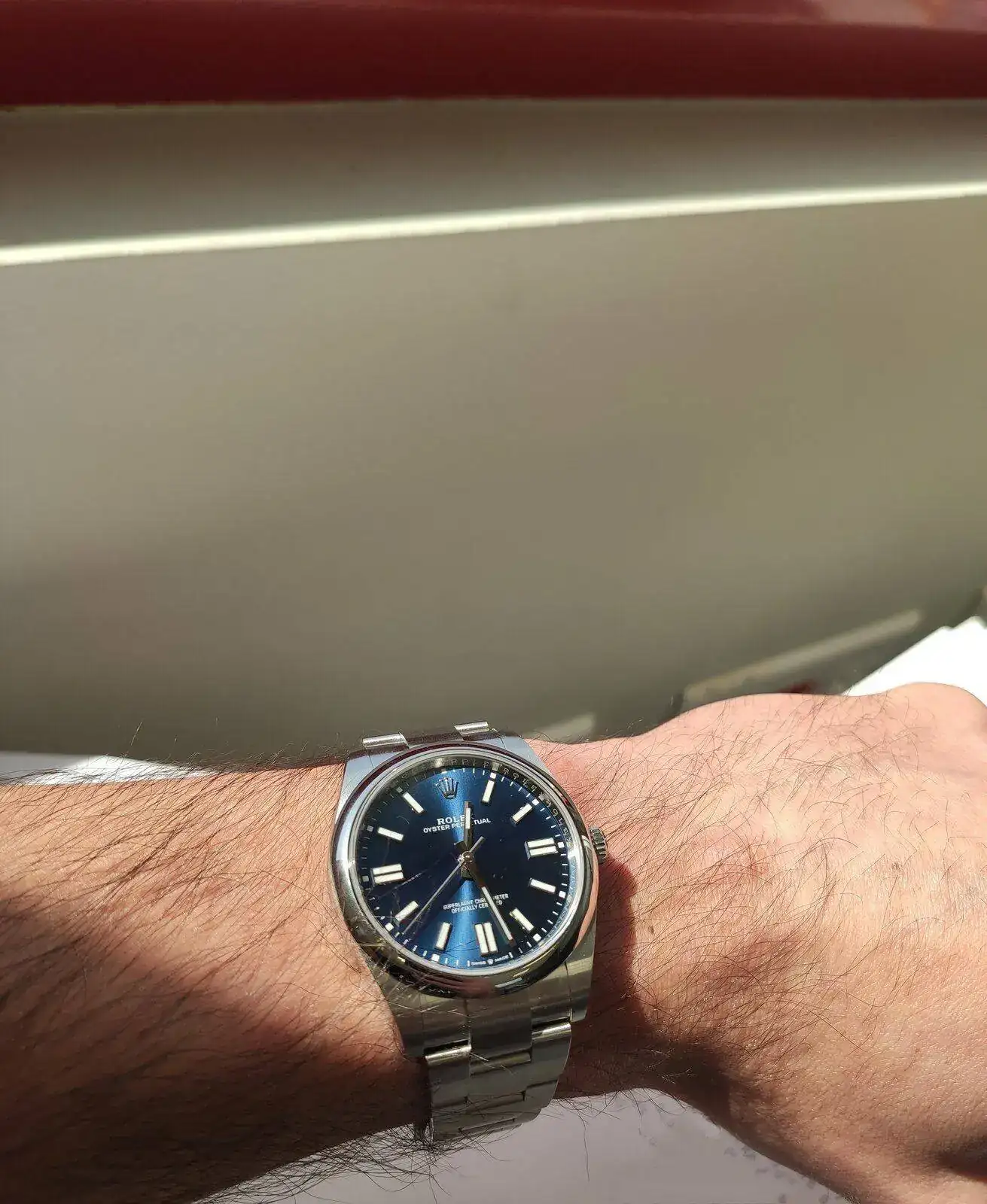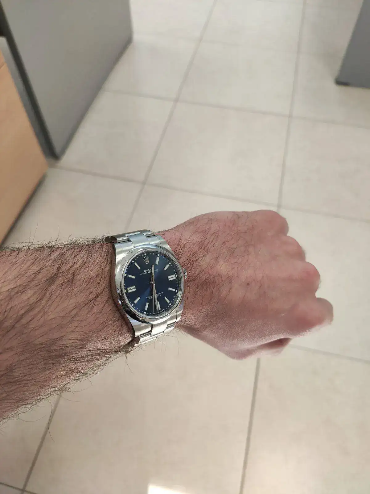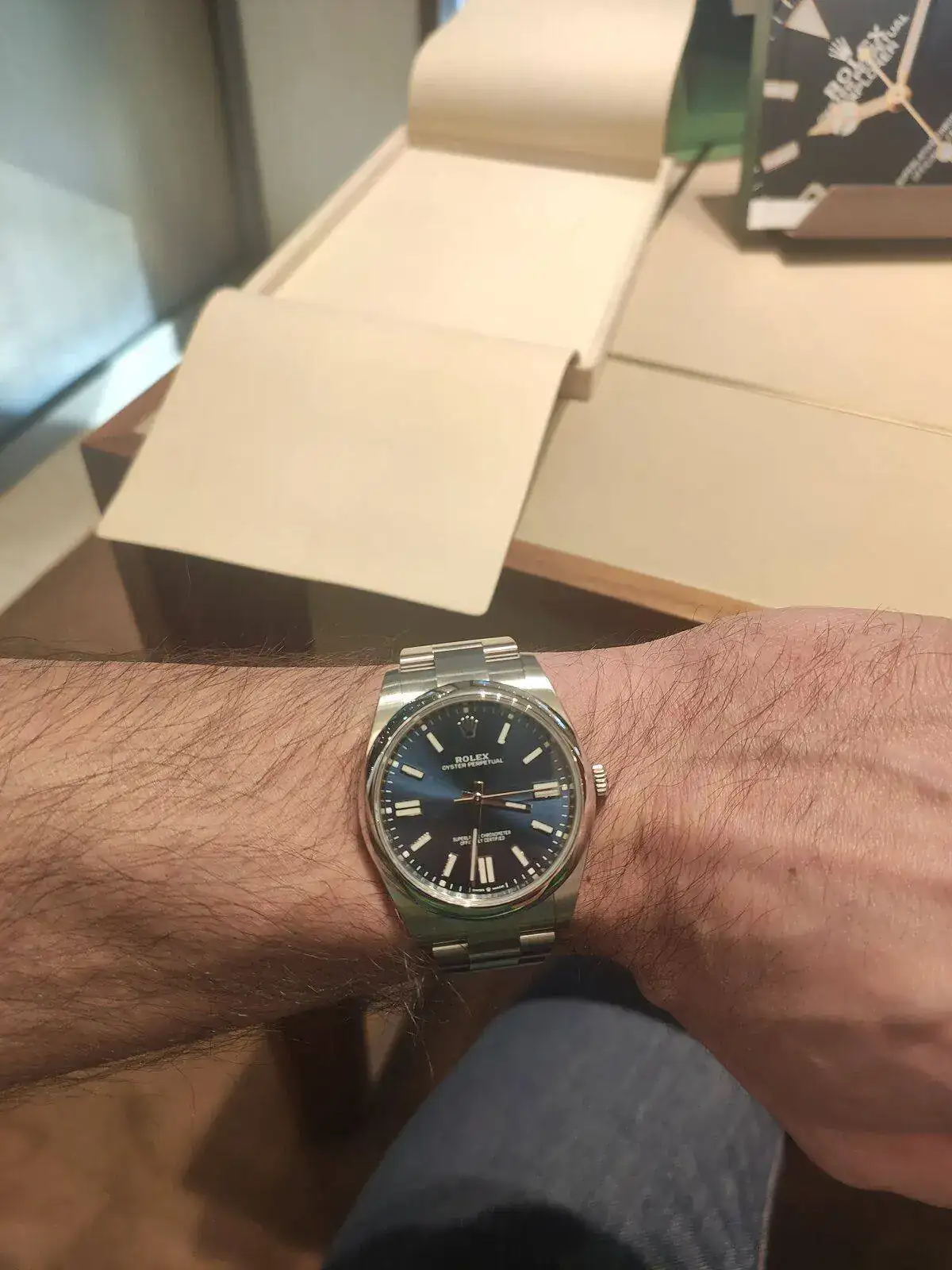 Tras ver todas las piezas que me interesaban que estaban disponibles y charlar un buen rato de relojes le pregunté si tenía algún OP en la tienda para poderme probar. Para mi sorpresa apareció con uno turquesa que ya estaba comprometido para otro cliente pero que pude ver en mi muñeca. El reloj me gustó mucho, lo que menos el color ya que buscaba algo más utilizable a diario. Después le consulté si tenía algún modelo de Rolex con una esfera similar a la azul para hacerme a la idea del color. Entonces, me sacó de la caja de fuerte un Datejust de color azul con bisel liso y brazalete Oyster que podría haber adquirido en el momento (con este gesto me quedó claro que tarde o temprano tendría mi OP). Como no era lo que estaba buscando al 100% debido al exceso de superficie pulida y a la fecha con lupa decliné su oferta y encargué mi OP. En ningún momento se me insinuó la compra de ningún otro artículo para agilizar la pieza que yo quería. Desde que lo pedí hasta que me ha llegado (7 meses) he hablado con ellos por teléfono un par de veces y me he pasado por la tienda otra para interesarme por la situación de mi reloj.