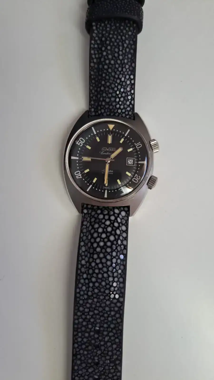 42mm sin contar las coronas, plexi y movimiento ETA 2472 (18.000 alternancias, 25 rubíes, reserva de 42h) en una auténtica caja Super Compressor. Las coronas están firmadas con la W de Duward.
