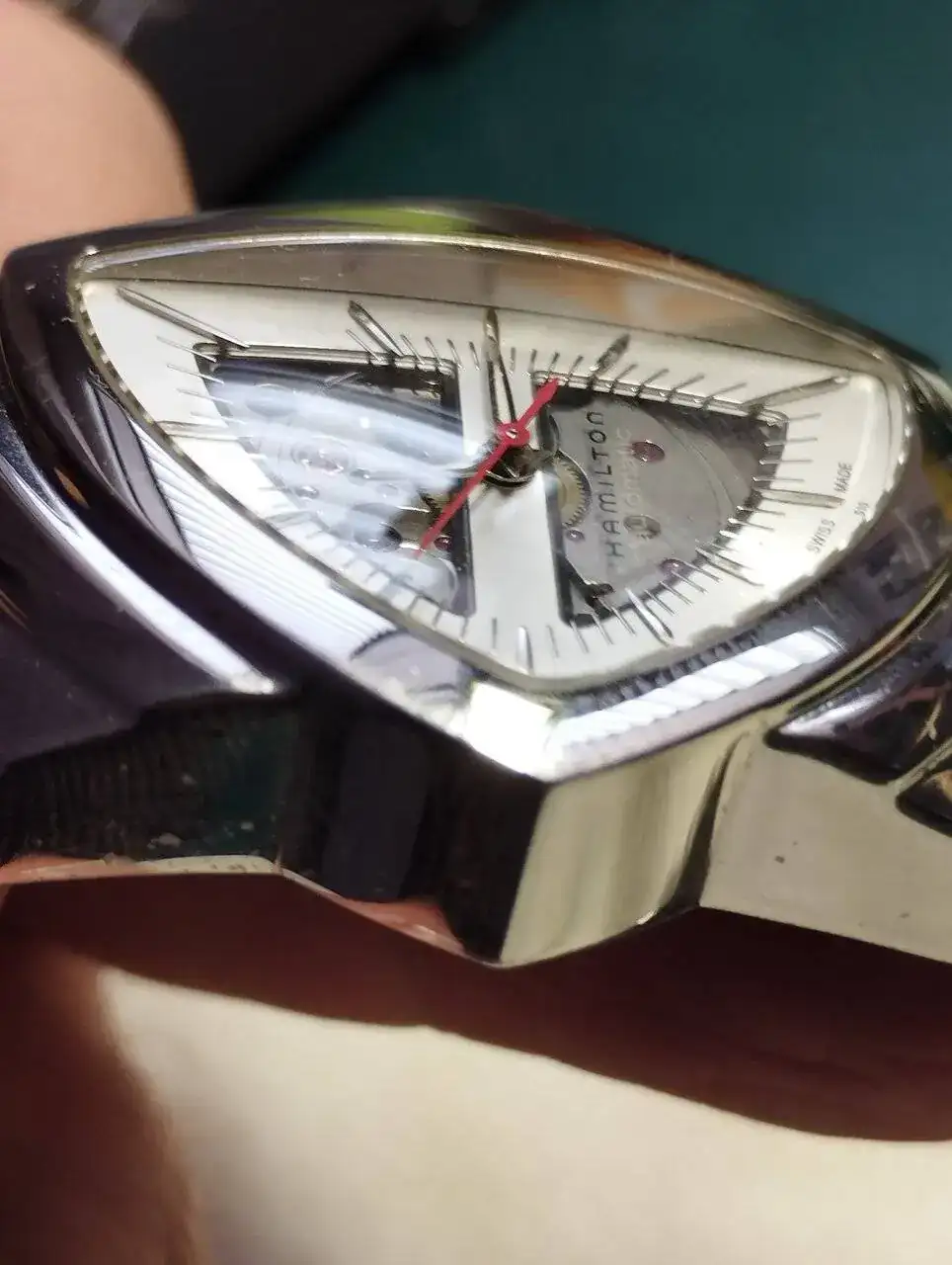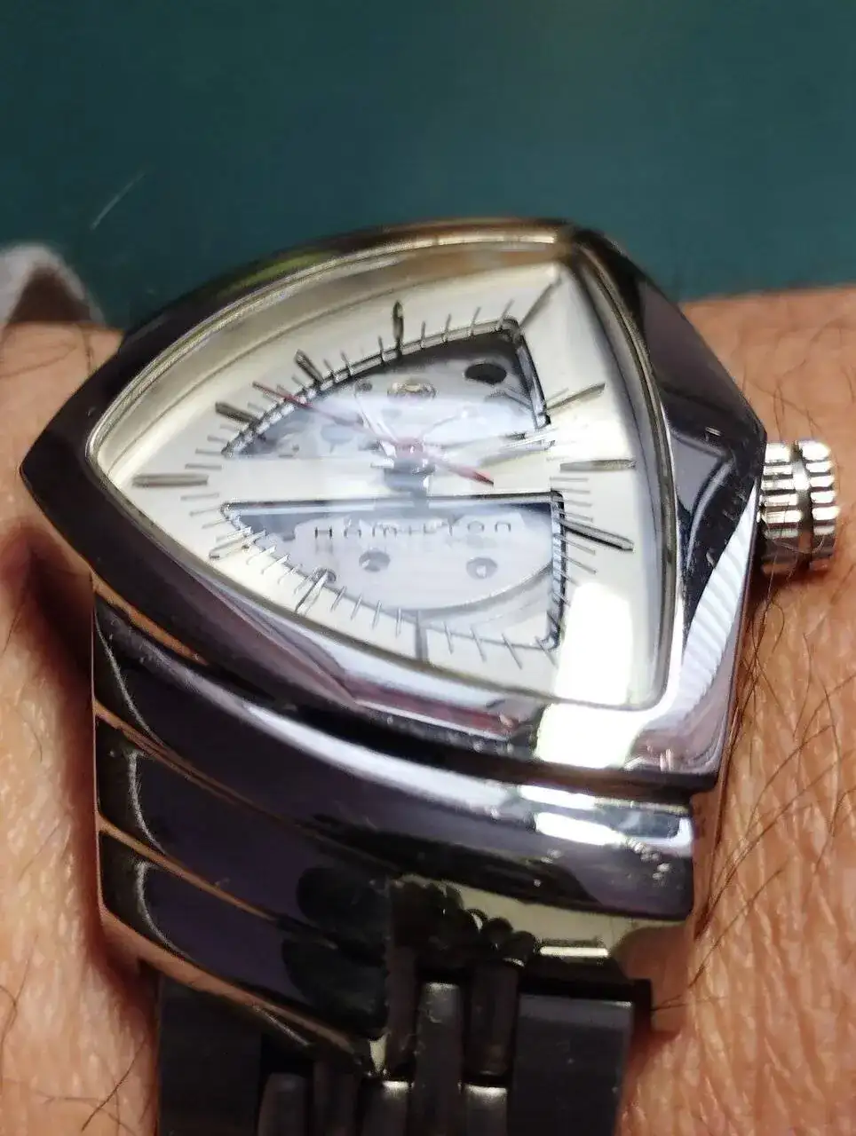 ¿Cómo saber si fueron las formas de esa época (guardabarros cromados brillantes de los automóviles, vaticinios de lo que sería el futuro) o la libertad absoluta lo que condujo a Arbib a realizar su improbable diseño? Lo que sí sabemos es que Hamilton encontró la forma de crear la caja de acero en forma de escudo, añadir una corona de manera original, desarrollar el modo de fijar la correa de cuero y el brazalete de metal, añadiendo lo que haría del Ventura un modelo especial.
