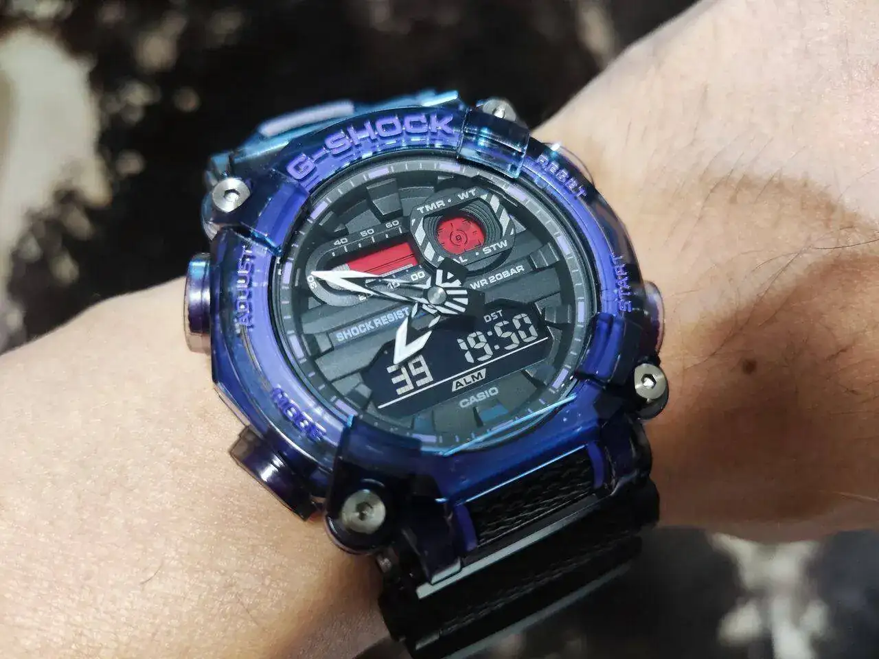 Se trata de un G-Shock GA-900TS-6AR, negro y púrpura translúcido, con banda reflectante en la pulsera.