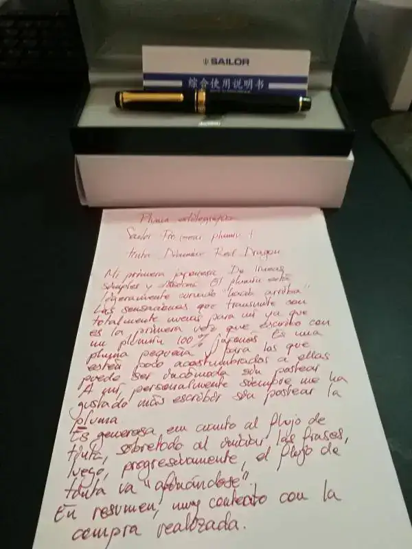 Me puse en contacto con los chicos de Iguana porque quería en principio una Visconti Rembrandt, pero al tener la letra pequeña, no me recomendaron el F de Visconti, que viene a ser un M, y como ya no fabrican en EF, me quedé con las ganas. Y vi ésta, y como ya me rondaba por la cabeza tener una Sailor desde hace tiempo, la pedí ayer y esta tarde ya la tengo conmigo.