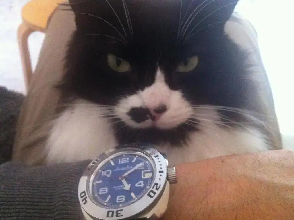 Os presento a Noa , gatita que encontramos abandonada recién nacida y aquí la teneís un año despues hecha una campeona vigilando su reloj favorito!! ( le encanta el olor del caucho del amphibia)
