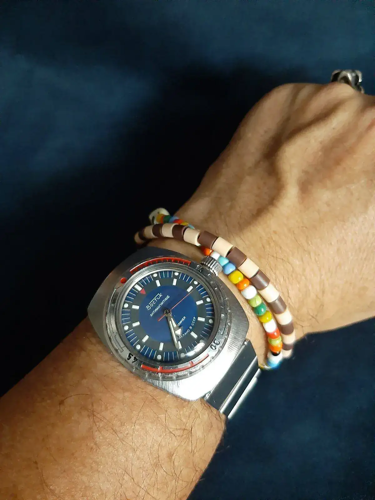 Le he calzado un brazalete de la epoca, de eslabones de lamina doblada que consegui hace unas semanas en un "tianguis" callejero y que tenia reservado para este ruso.