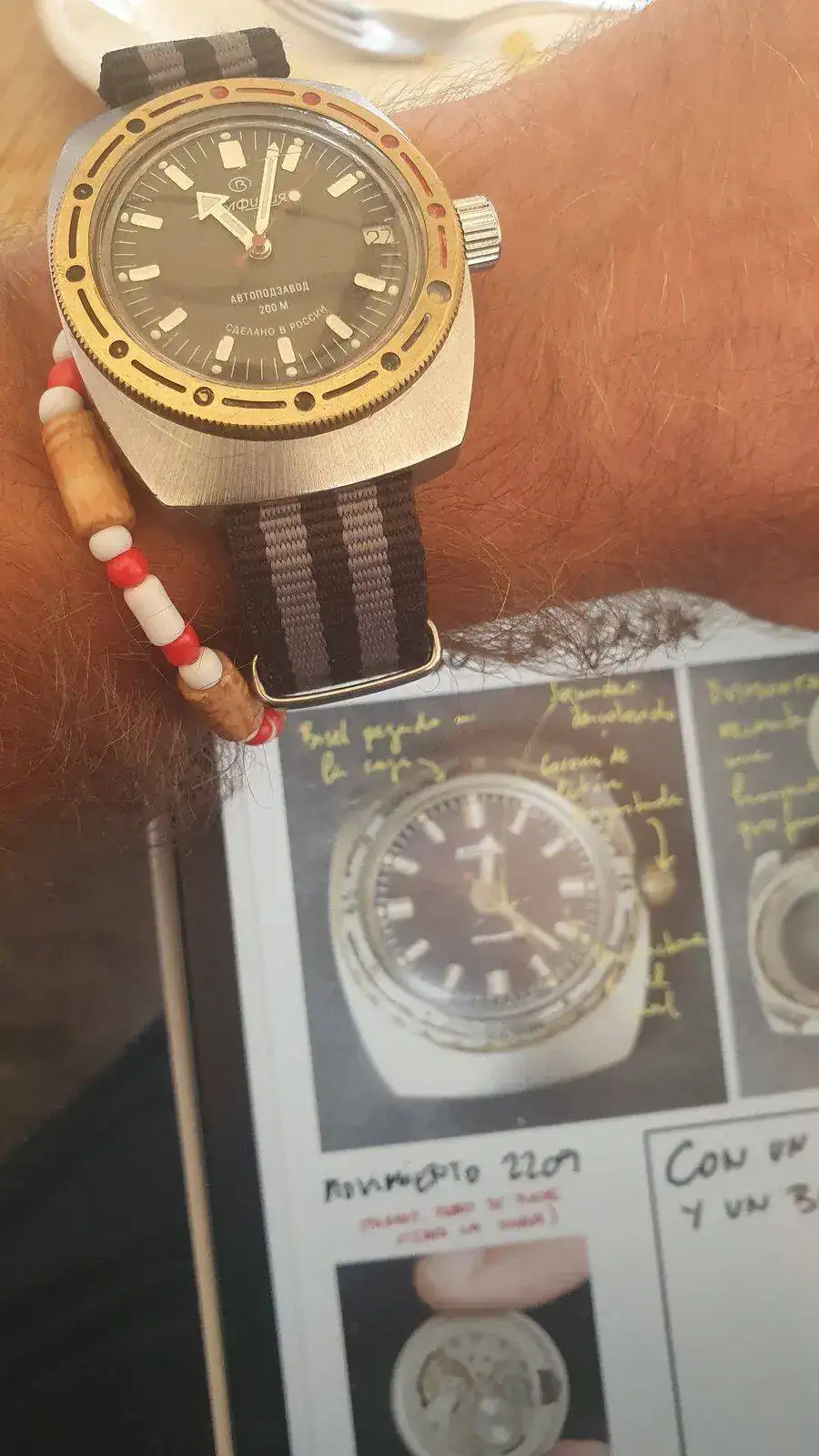 Pues sí, hace un par de dias el cartero me trajo mi un paquetito de Ucrania, con mi segunda caja 119, nada mas llegar fue ponerlo a funcionar, pero despues de unas horas atrasaba, unos cinco minutos despues de unas seis horas de funcionamiento, y cuando lo movia se percibia un movimiento y un ruido no comun, por lo que decidi abrirlo, (fue como darle un telescopio a un mono), la verdad que no tengo idea de que se debe hacer, pero revisando, un par de tornillos, ubicados en las 12 y las 6 se parece que son los que sujetan el movimiento, se precibian sueltos y esa era la razon del movimiento que se percibia al agitar el reloj, por lo que decidi apretarlos.